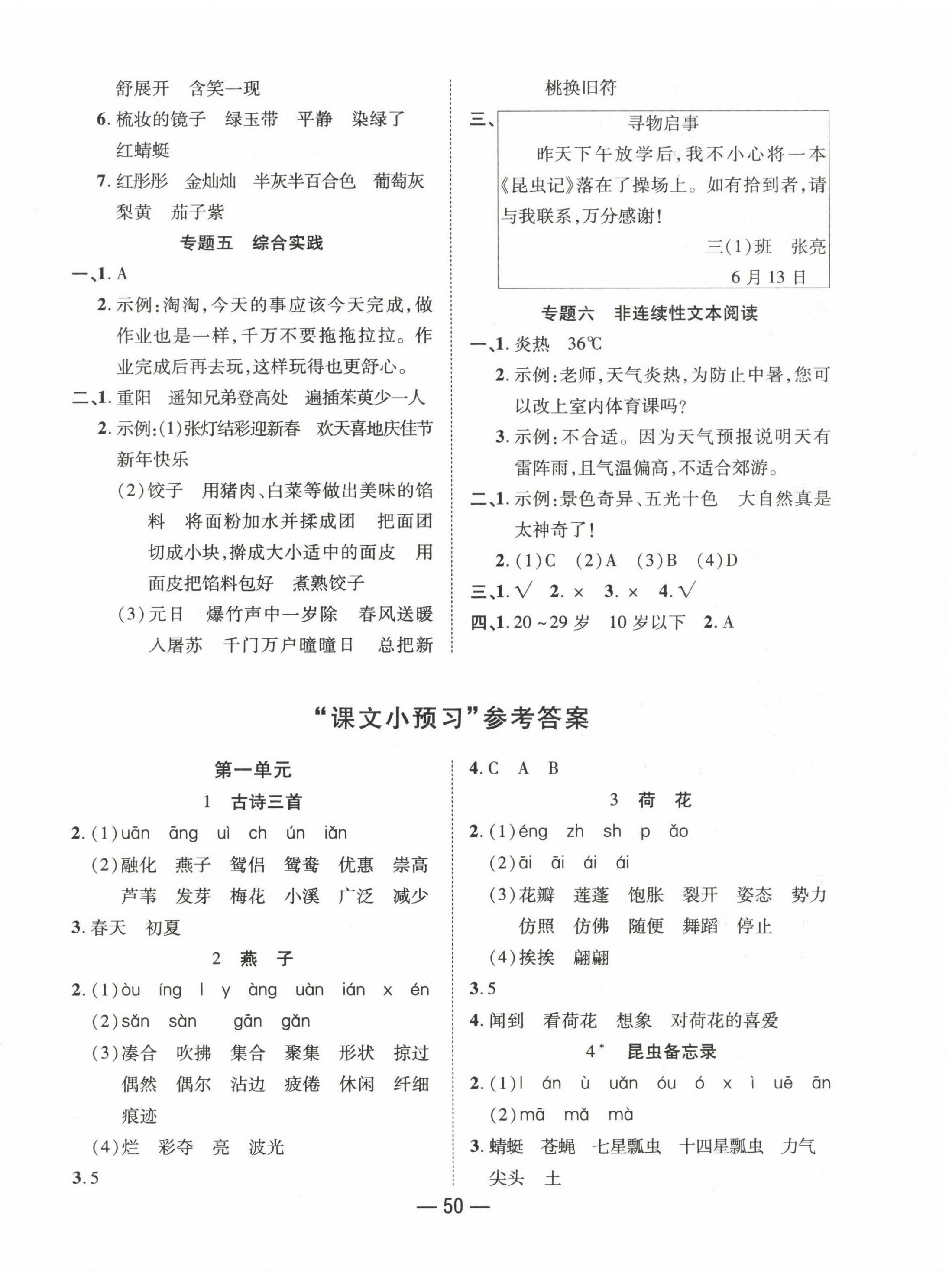 注:目前有些书本章节名称可能整理的还不是很完善,但都是按照顺序排列的,请同学们按照顺序仔细查找。练习册 2023年尚学生香英才天天练三年级语文下册人教版浙江专版 答案主要是用来给同学们做完题方便对答案用的,请勿直接抄袭。