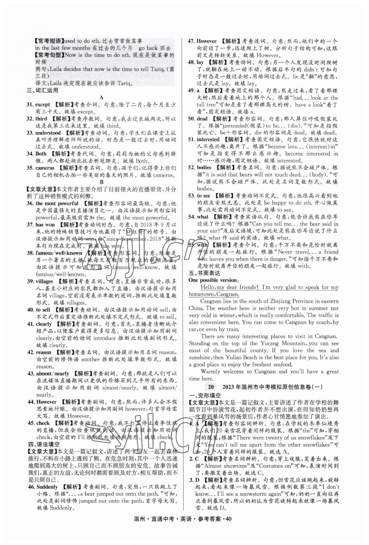 注:目前有些书本章节名称可能整理的还不是很完善,但都是按照顺序排列的,请同学们按照顺序仔细查找。练习册 2023年直通中考中考试题精编英语温州专版 答案主要是用来给同学们做完题方便对答案用的,请勿直接抄袭。