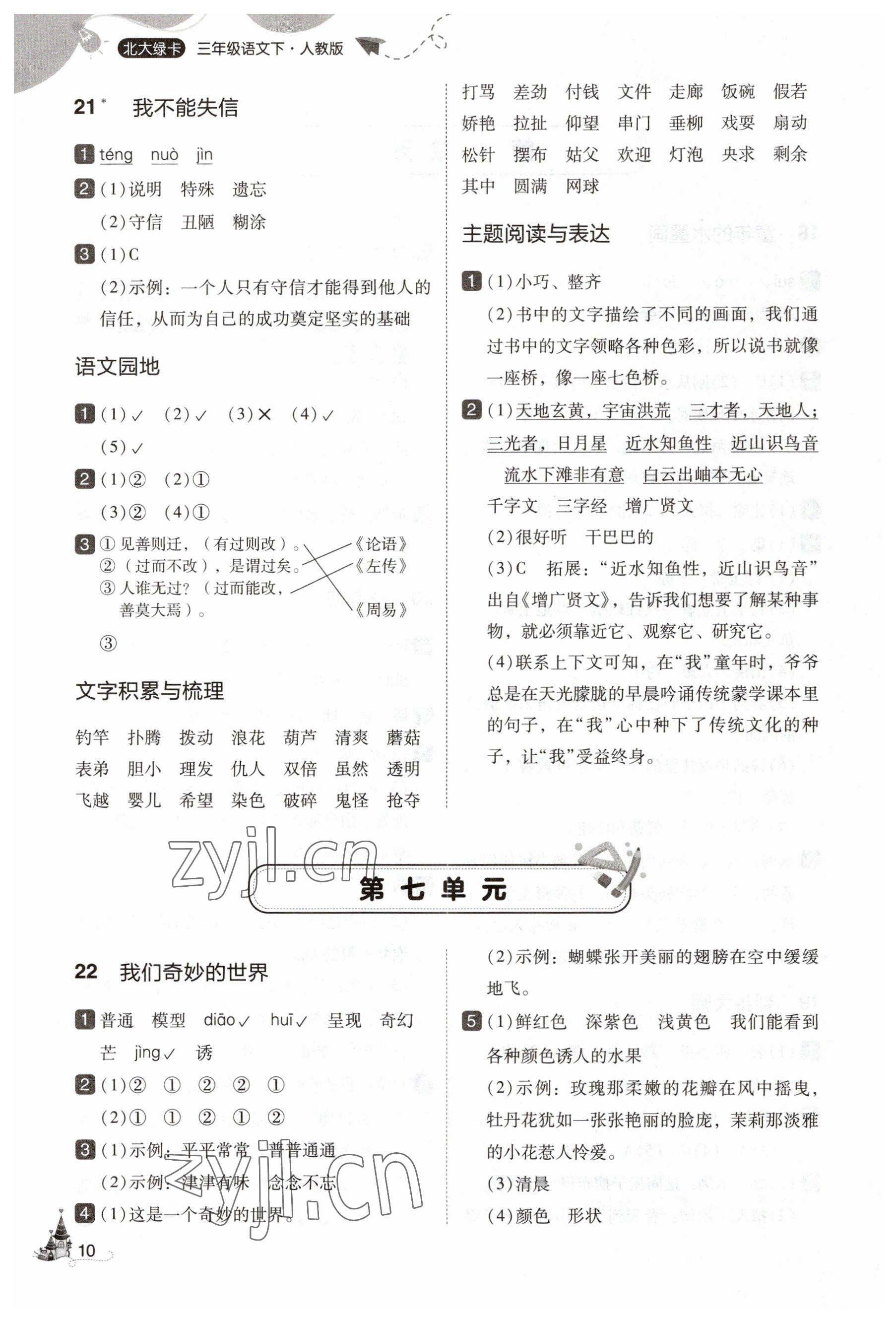 注:目前有些书本章节名称可能整理的还不是很完善,但都是按照顺序排列的,请同学们按照顺序仔细查找。练习册 2023年北大绿卡三年级语文下册人教版 答案主要是用来给同学们做完题方便对答案用的,请勿直接抄袭。