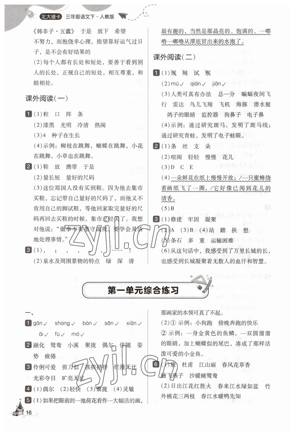 注:目前有些书本章节名称可能整理的还不是很完善,但都是按照顺序排列的,请同学们按照顺序仔细查找。练习册 2023年北大绿卡三年级语文下册人教版 答案主要是用来给同学们做完题方便对答案用的,请勿直接抄袭。