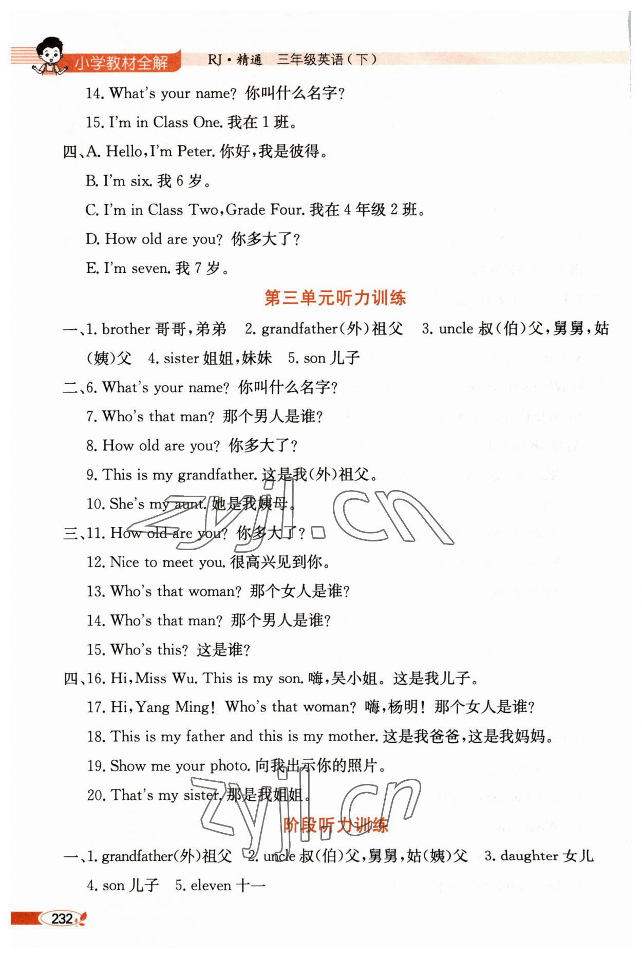 注:目前有些书本章节名称可能整理的还不是很完善,但都是按照顺序排列的,请同学们按照顺序仔细查找。练习册 2023年教材全解三年级英语下册人教精通版 答案主要是用来给同学们做完题方便对答案用的,请勿直接抄袭。