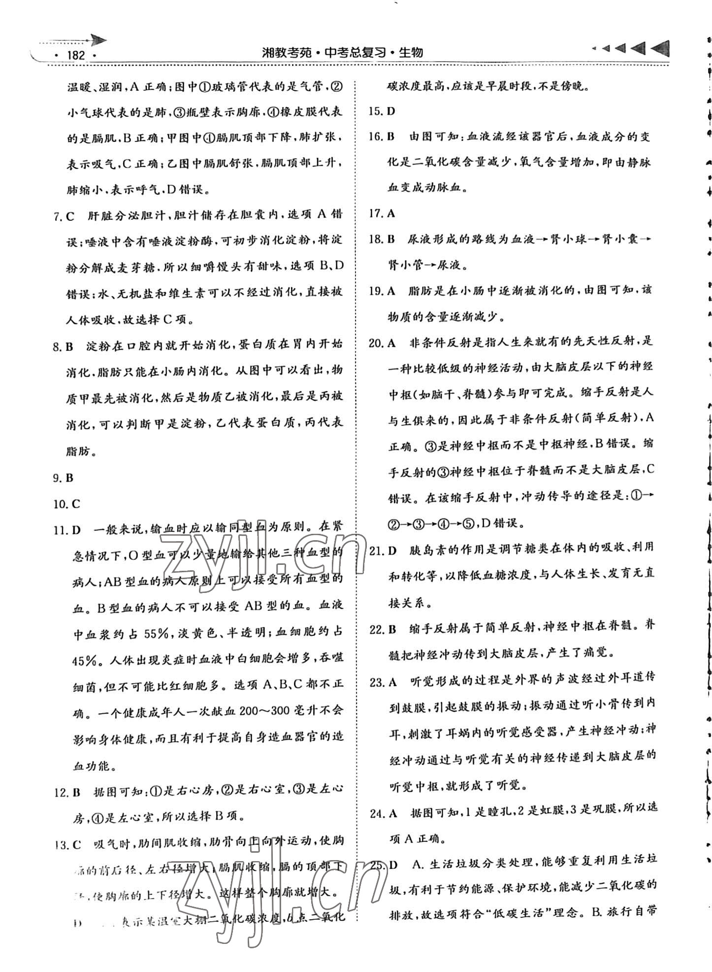 注:目前有些书本章节名称可能整理的还不是很完善,但都是按照顺序排列的,请同学们按照顺序仔细查找。练习册 2023年湘教考苑中考总复习生物 答案主要是用来给同学们做完题方便对答案用的,请勿直接抄袭。