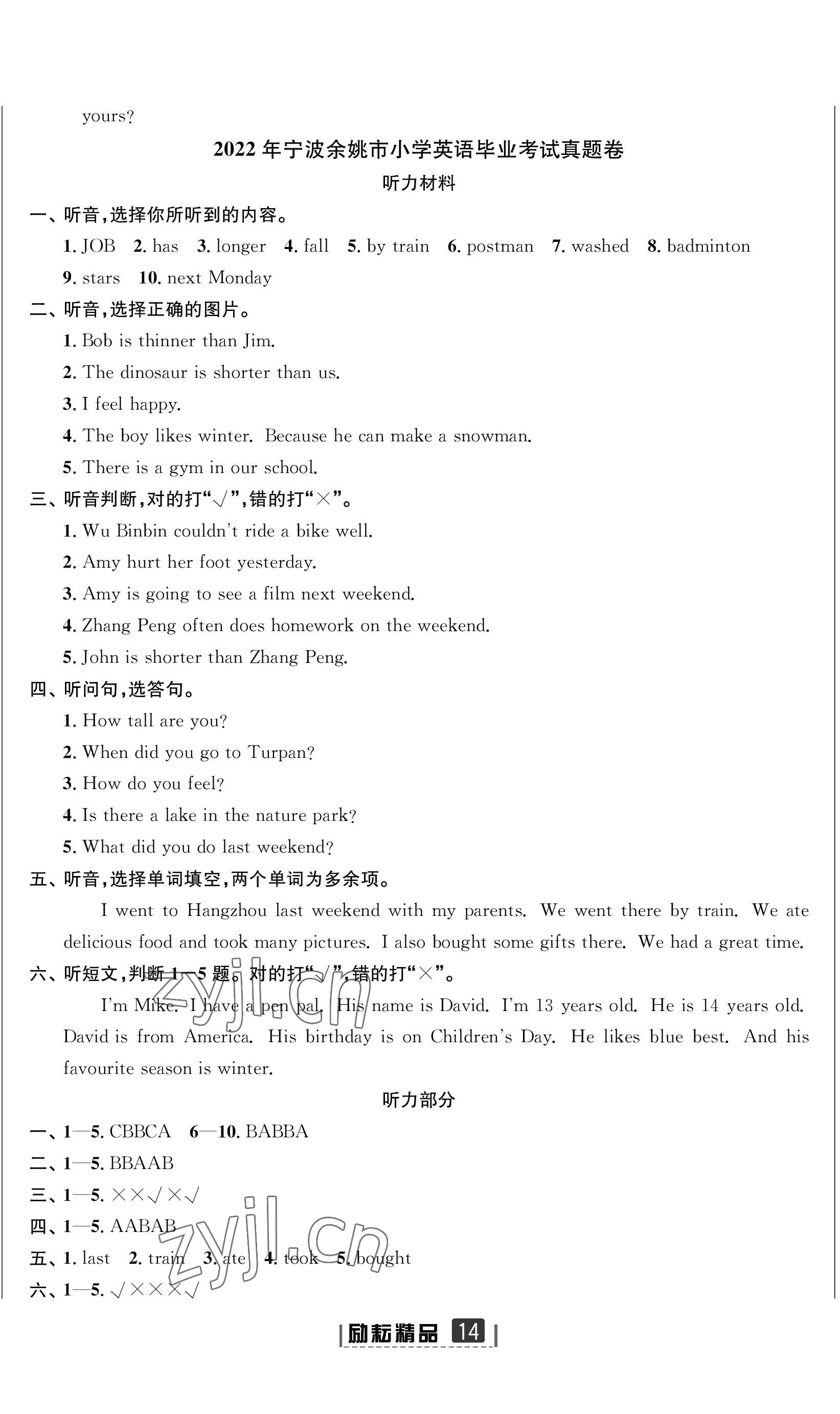 注:目前有些书本章节名称可能整理的还不是很完善,但都是按照顺序排列的,请同学们按照顺序仔细查找。练习册 2023年励耘小考助跑卷六年级英语宁波专版 答案主要是用来给同学们做完题方便对答案用的,请勿直接抄袭。