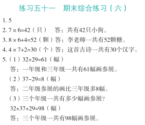 注:目前有些书本章节名称可能整理的还不是很完善,但都是按照顺序排列的,请同学们按照顺序仔细查找。练习册 2023年应用题思维强化训练二年级数学全一册人教版 答案主要是用来给同学们做完题方便对答案用的,请勿直接抄袭。