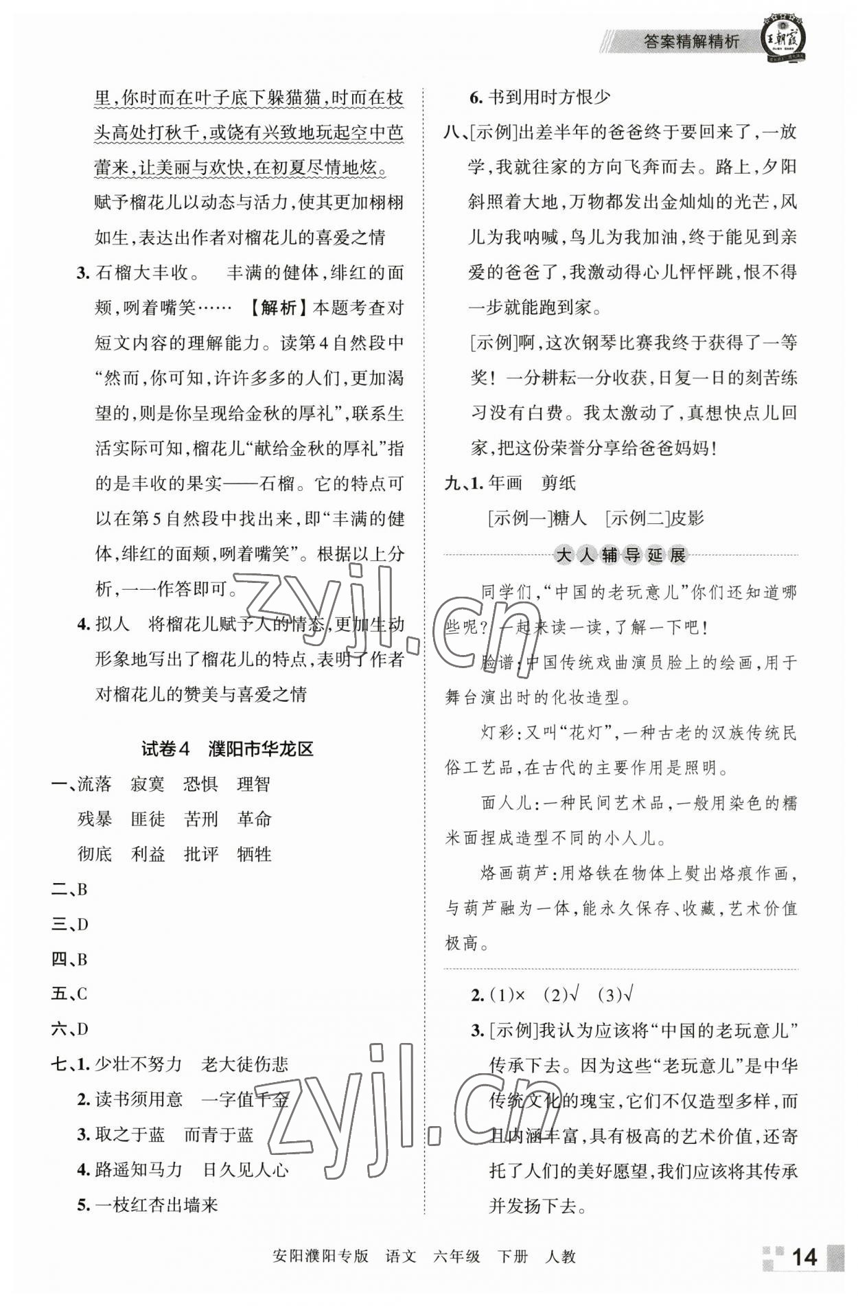 注:目前有些书本章节名称可能整理的还不是很完善,但都是按照顺序排列的,请同学们按照顺序仔细查找。练习册 2023年王朝霞期末真题精编六年级语文下册人教版安濮专版 答案主要是用来给同学们做完题方便对答案用的,请勿直接抄袭。