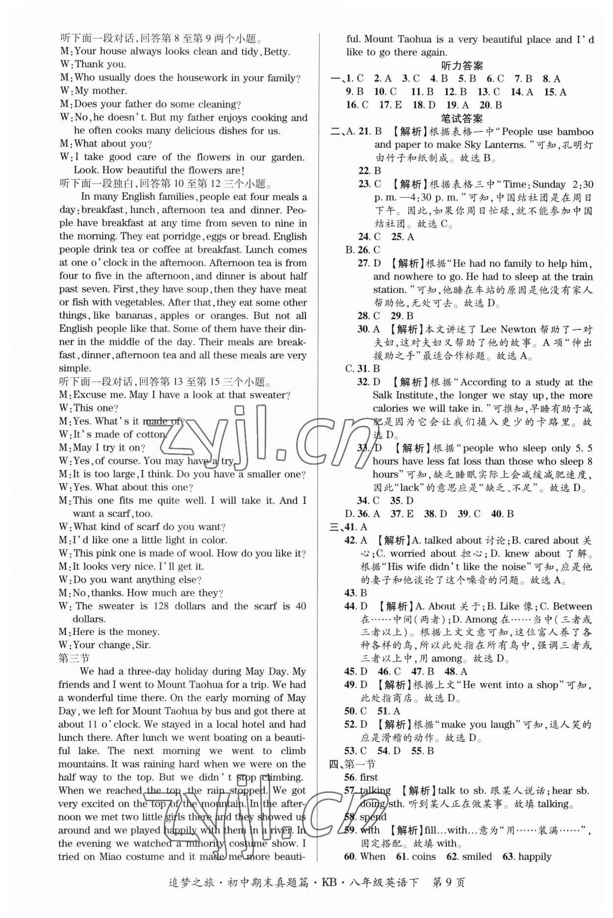 注:目前有些书本章节名称可能整理的还不是很完善,但都是按照顺序排列的,请同学们按照顺序仔细查找。练习册 2023年追梦之旅初中期末真题篇八年级英语下册仁爱版河南专版 答案主要是用来给同学们做完题方便对答案用的,请勿直接抄袭。