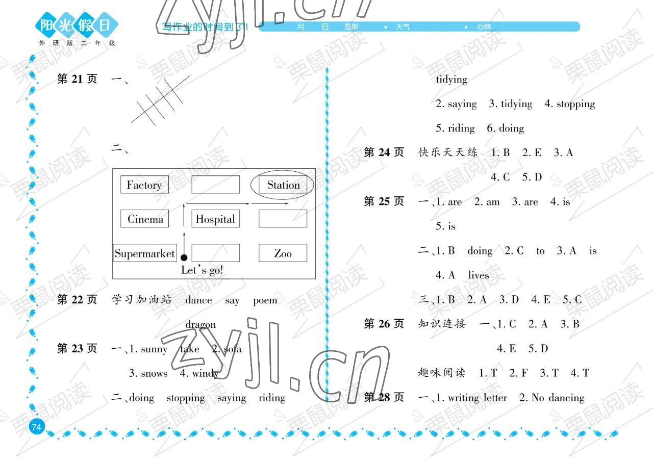 注:目前有些书本章节名称可能整理的还不是很完善,但都是按照顺序排列的,请同学们按照顺序仔细查找。练习册 2023年暑假Happy假日二年级英语外研版 答案主要是用来给同学们做完题方便对答案用的,请勿直接抄袭。