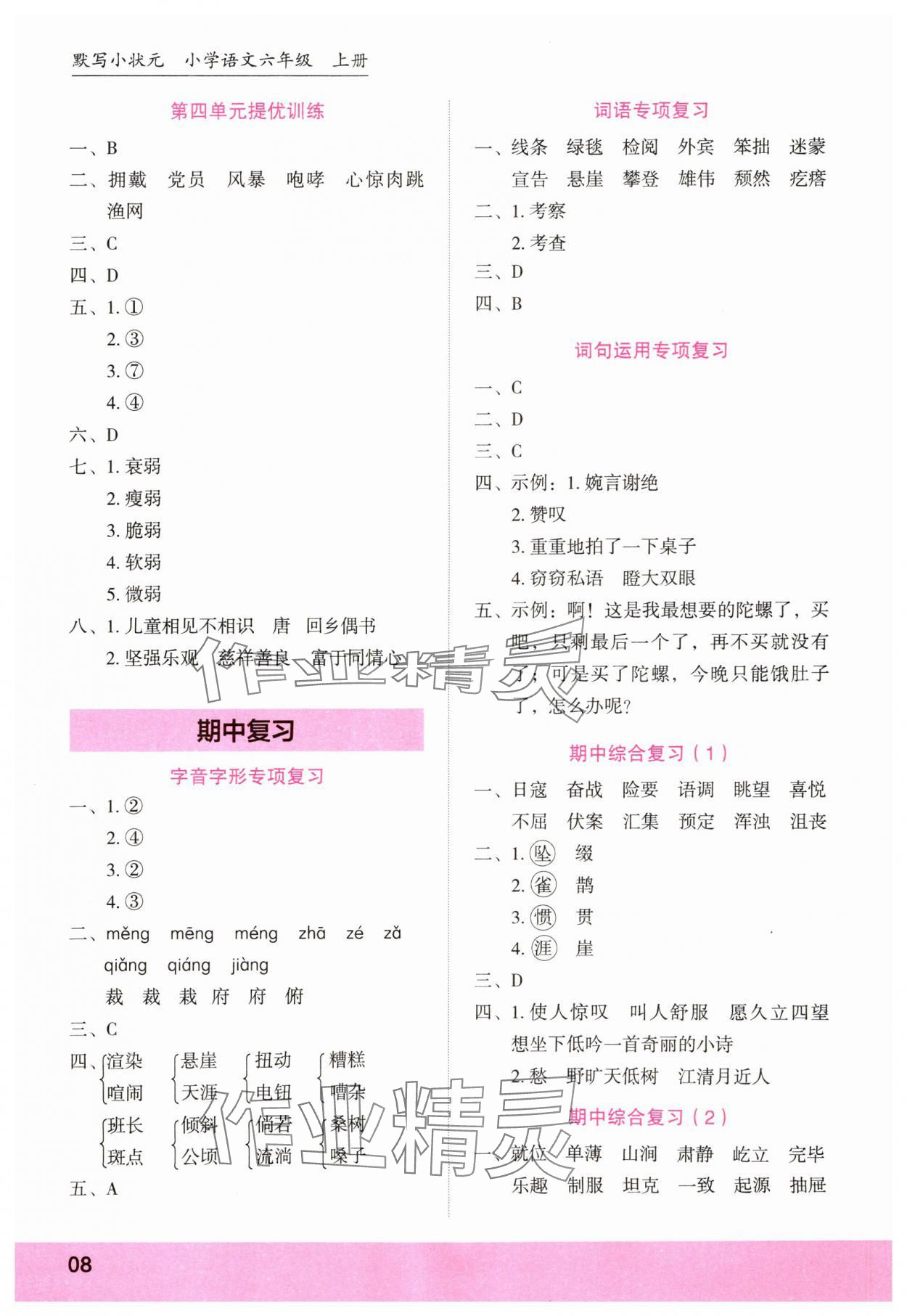注:目前有些书本章节名称可能整理的还不是很完善,但都是按照顺序排列的,请同学们按照顺序仔细查找。练习册 2023年默写小状元六年级语文上册人教版 答案主要是用来给同学们做完题方便对答案用的,请勿直接抄袭。