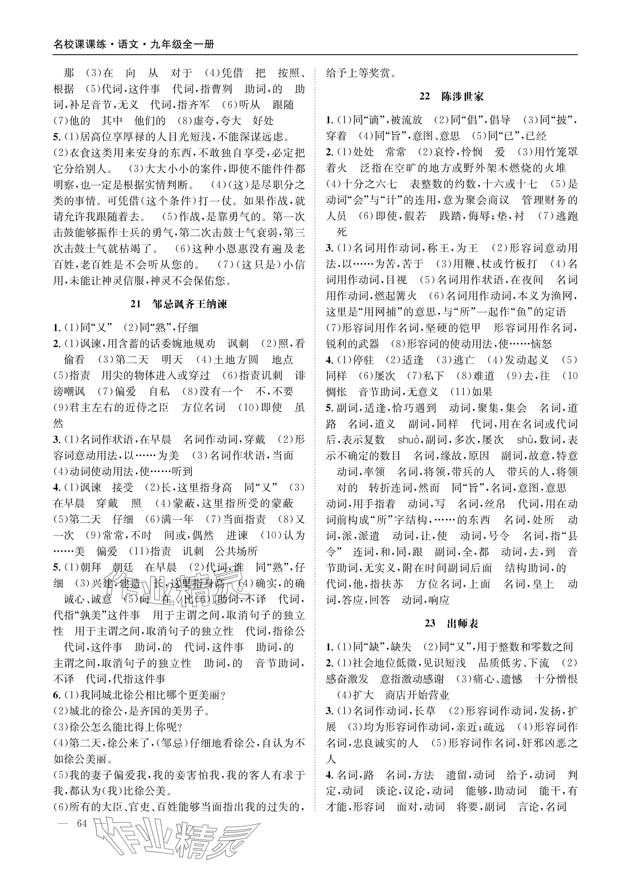 注:目前有些书本章节名称可能整理的还不是很完善,但都是按照顺序排列的,请同学们按照顺序仔细查找。练习册 2023年名校课课练九年级语文全一册人教版 答案主要是用来给同学们做完题方便对答案用的,请勿直接抄袭。