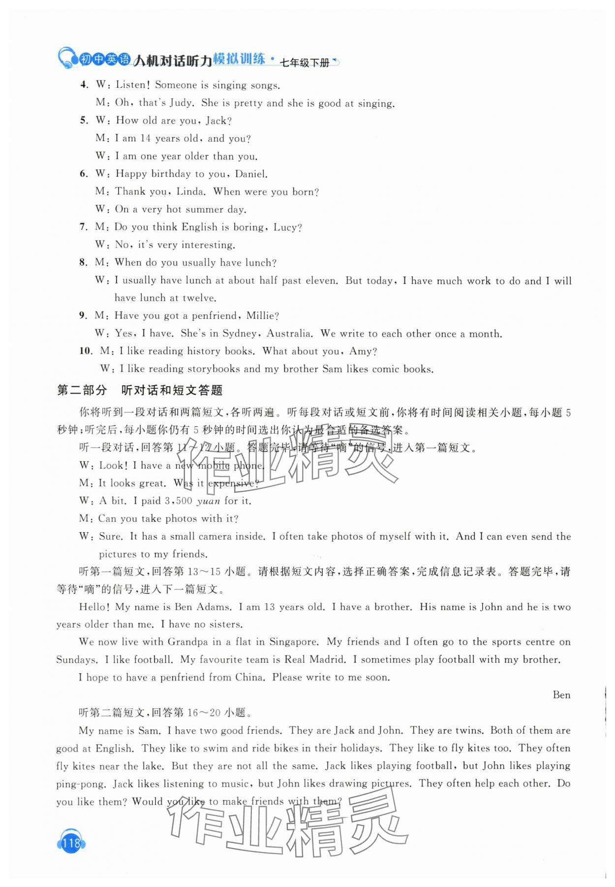 注:目前有些书本章节名称可能整理的还不是很完善,但都是按照顺序排列的,请同学们按照顺序仔细查找。练习册 2024年初中英语人机对话听力模拟训练七年级下册 答案主要是用来给同学们做完题方便对答案用的,请勿直接抄袭。