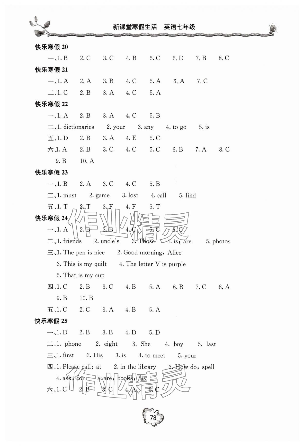 注:目前有些书本章节名称可能整理的还不是很完善,但都是按照顺序排列的,请同学们按照顺序仔细查找。练习册 2024年新课堂寒假生活七年级英语人教版 答案主要是用来给同学们做完题方便对答案用的,请勿直接抄袭。