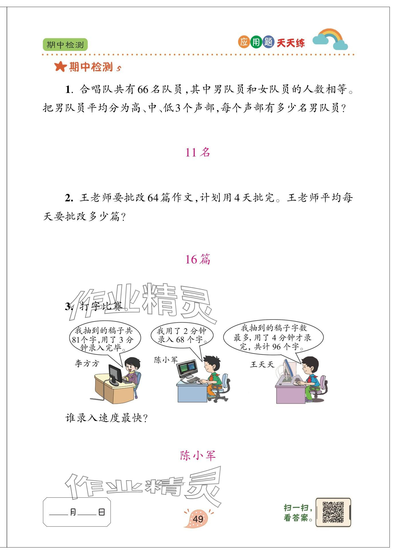 注:目前有些书本章节名称可能整理的还不是很完善,但都是按照顺序排列的,请同学们按照顺序仔细查找。练习册 2024年应用题天天练青岛出版社三年级数学下册青岛版 答案主要是用来给同学们做完题方便对答案用的,请勿直接抄袭。