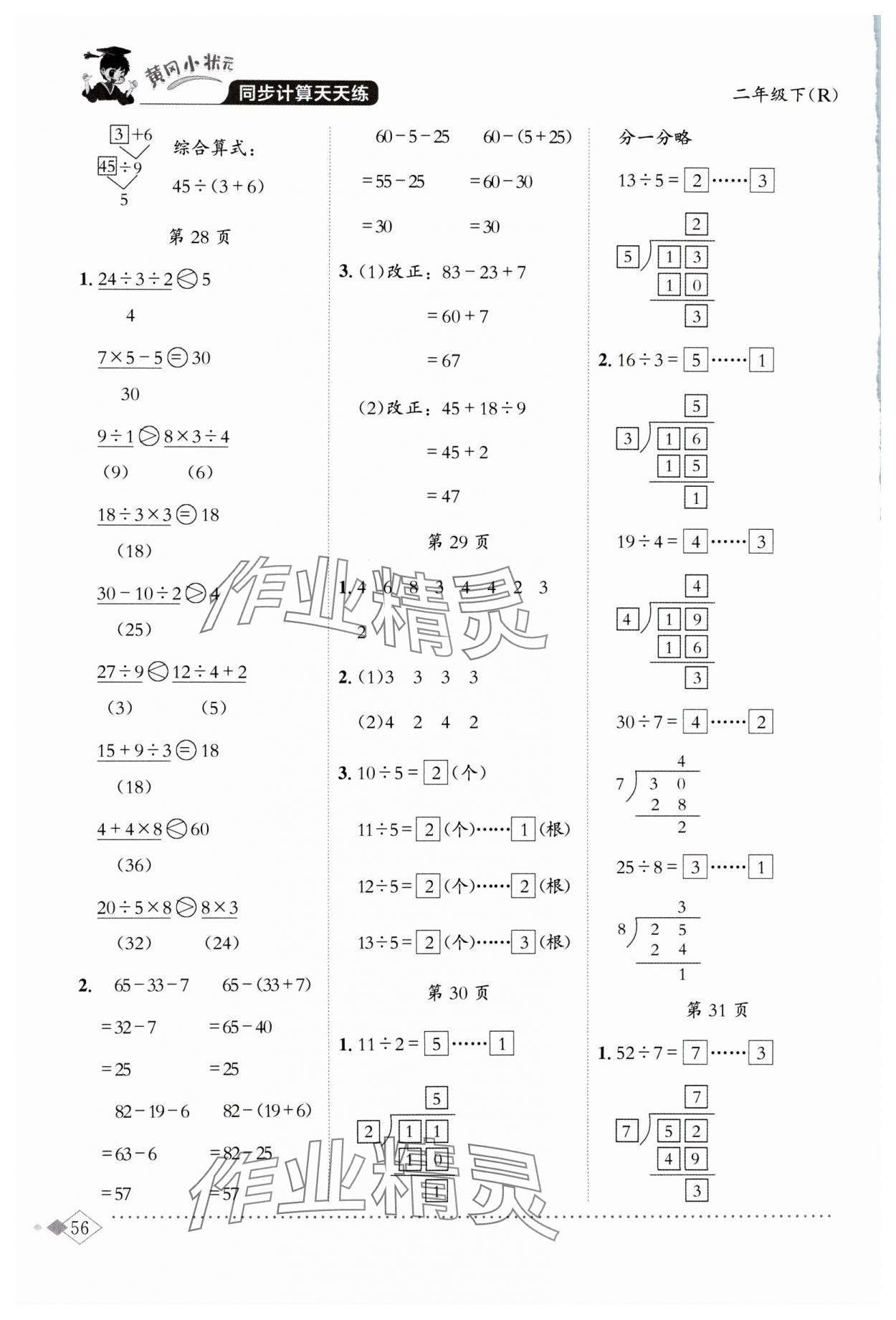 注:目前有些书本章节名称可能整理的还不是很完善,但都是按照顺序排列的,请同学们按照顺序仔细查找。练习册 2024年黄冈小状元同步计算天天练二年级数学下册人教版 答案主要是用来给同学们做完题方便对答案用的,请勿直接抄袭。