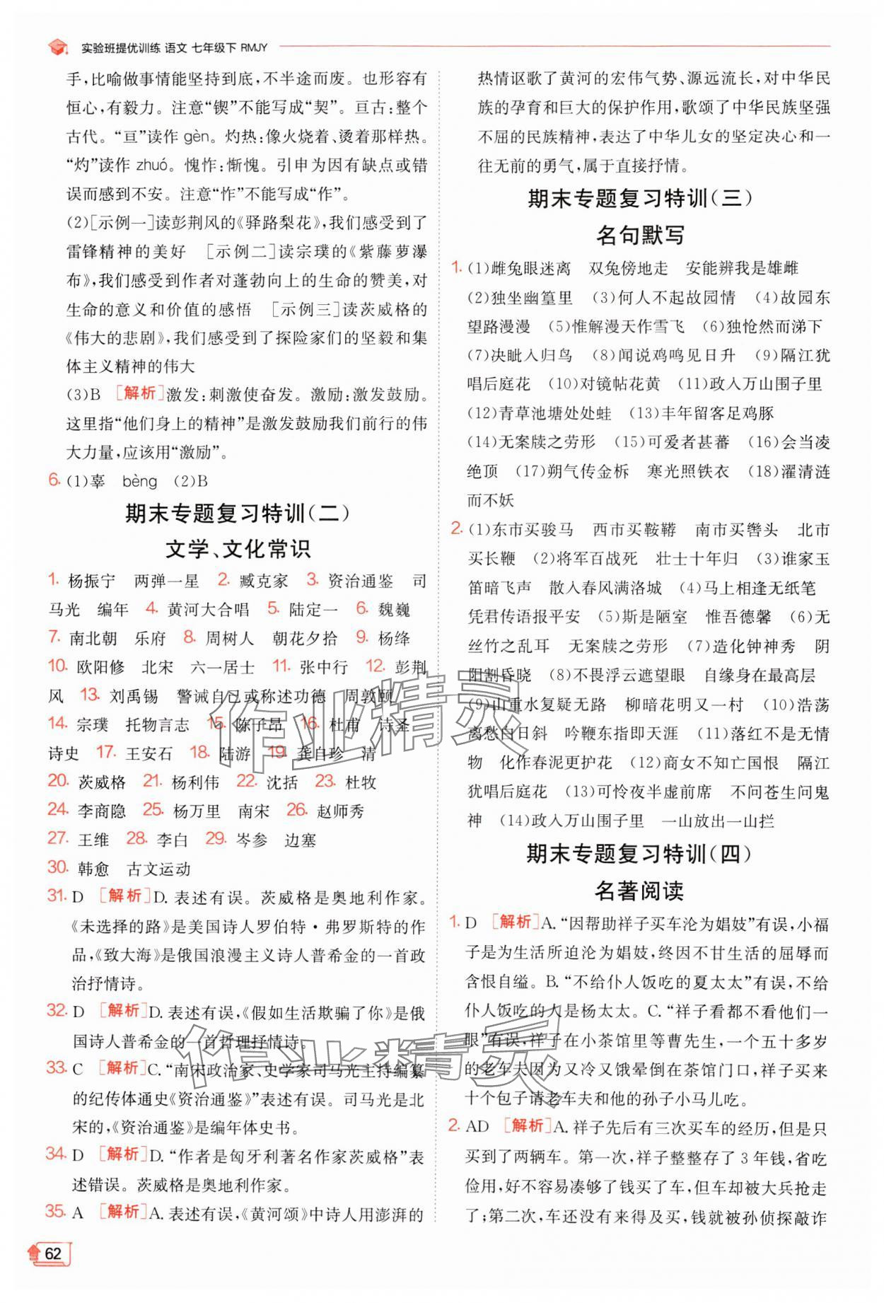 注:目前有些书本章节名称可能整理的还不是很完善,但都是按照顺序排列的,请同学们按照顺序仔细查找。练习册 2024年实验班提优训练七年级语文下册人教版江苏专版 答案主要是用来给同学们做完题方便对答案用的,请勿直接抄袭。