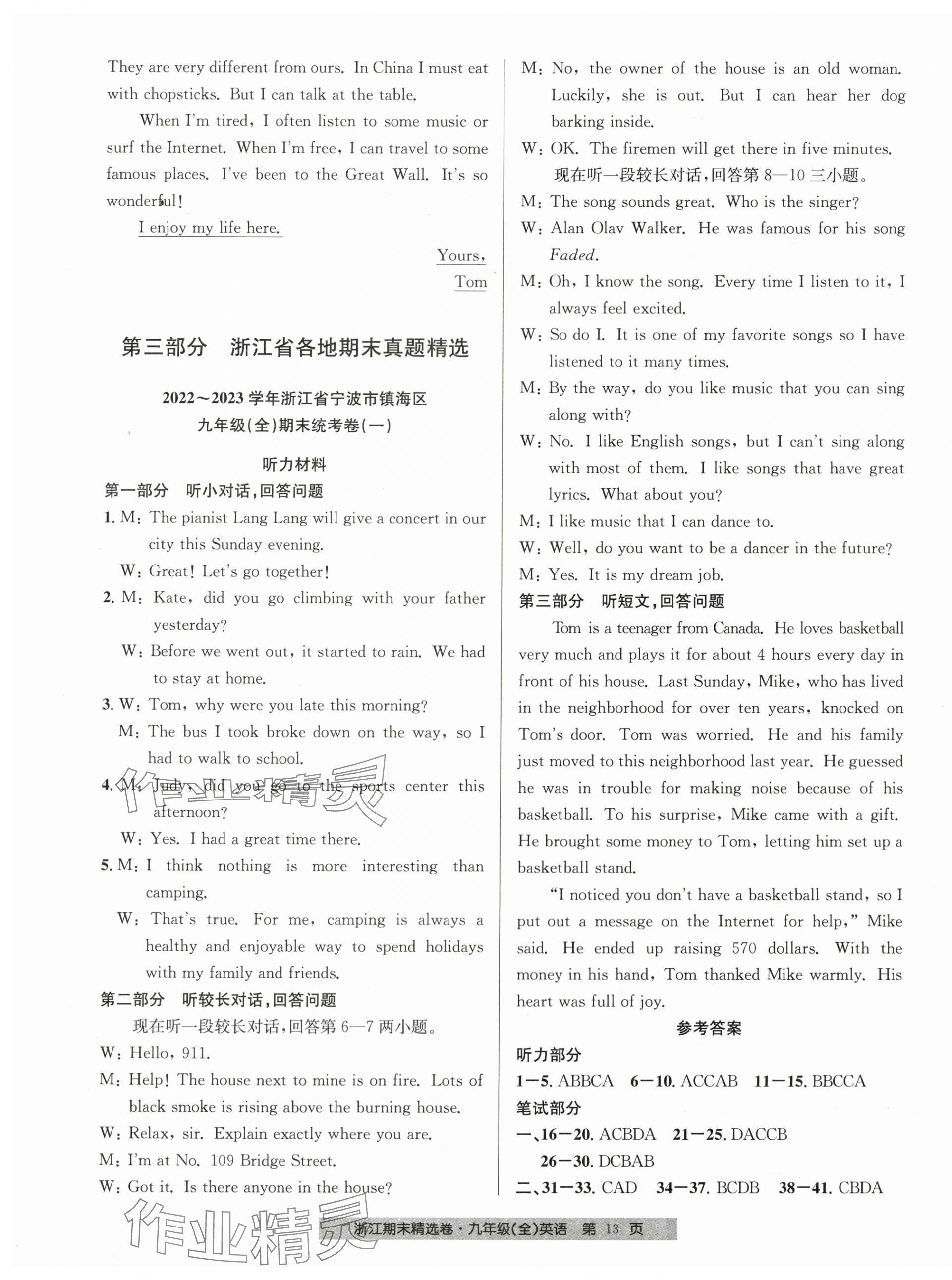 注:目前有些书本章节名称可能整理的还不是很完善,但都是按照顺序排列的,请同学们按照顺序仔细查找。练习册 2023年浙江期末精选卷九年级英语全一册人教版 答案主要是用来给同学们做完题方便对答案用的,请勿直接抄袭。