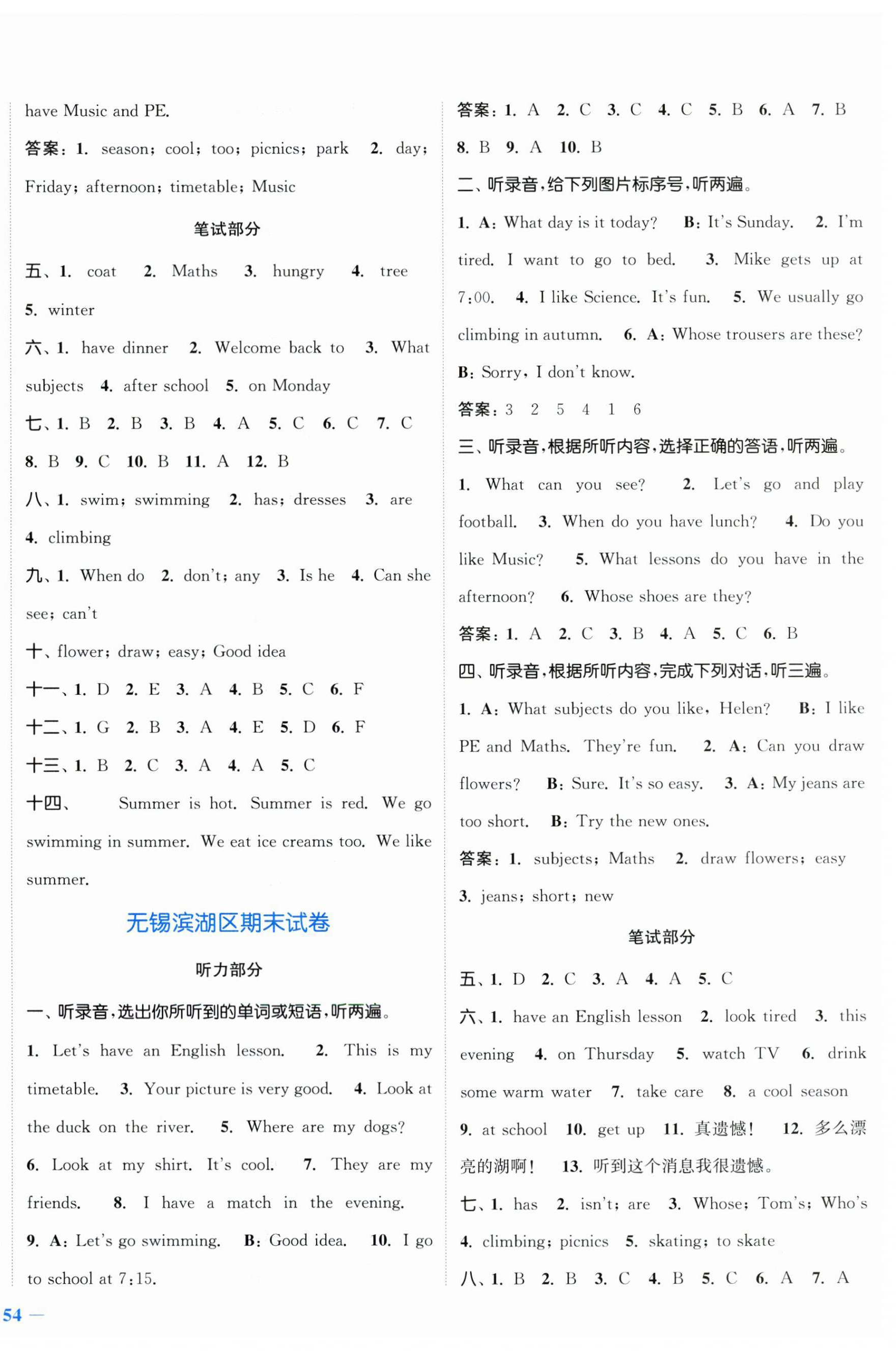 注:目前有些书本章节名称可能整理的还不是很完善,但都是按照顺序排列的,请同学们按照顺序仔细查找。练习册 2024年江苏金考卷四年级英语下册译林版 答案主要是用来给同学们做完题方便对答案用的,请勿直接抄袭。