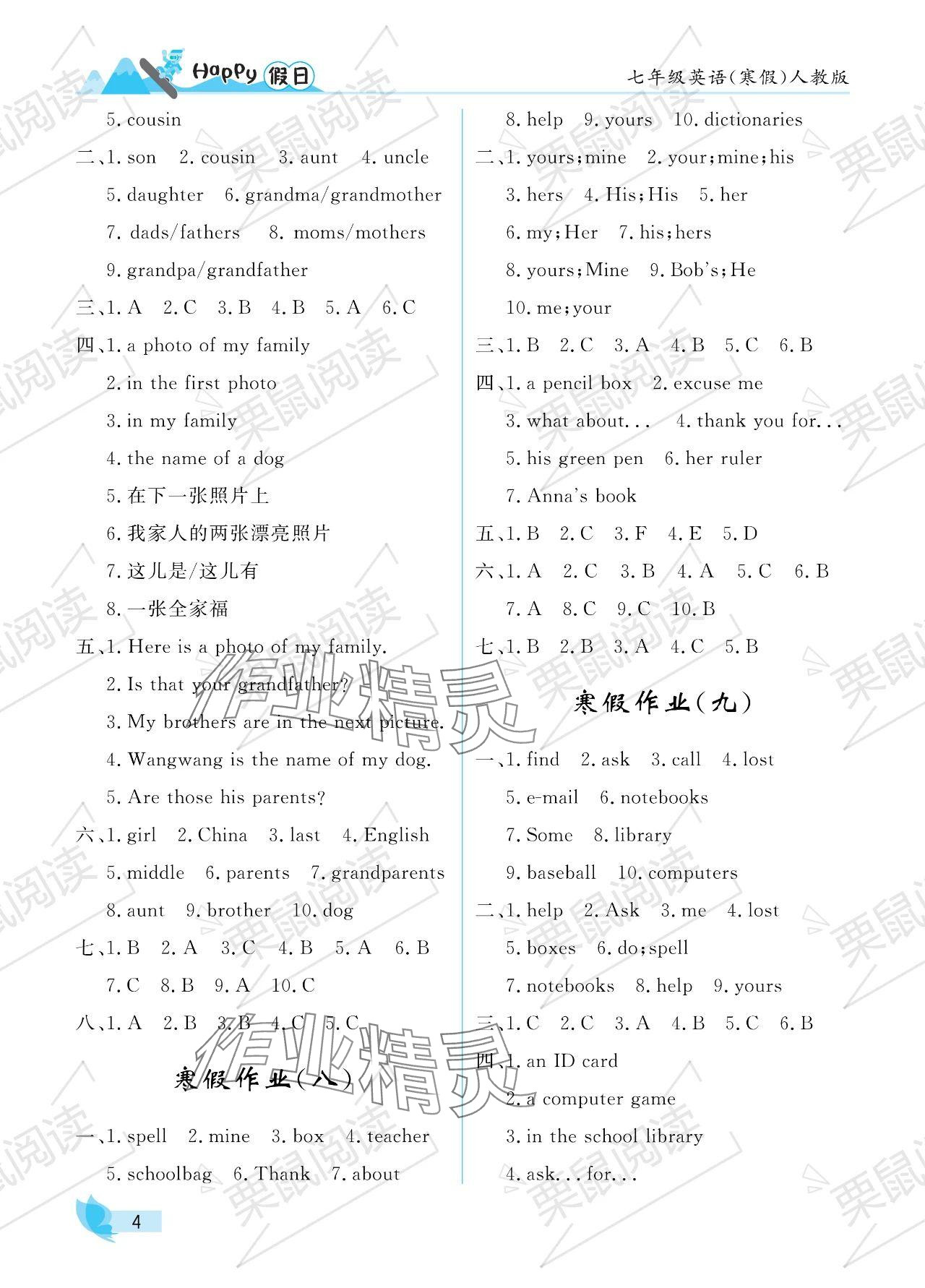 注:目前有些书本章节名称可能整理的还不是很完善,但都是按照顺序排列的,请同学们按照顺序仔细查找。练习册 2024年寒假Happy假日七年级英语人教版 答案主要是用来给同学们做完题方便对答案用的,请勿直接抄袭。