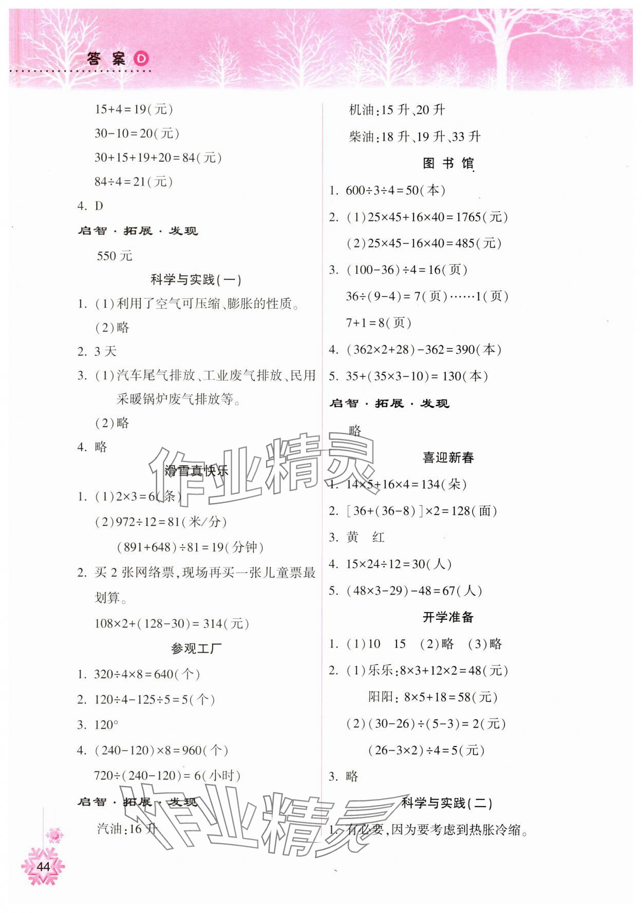 注:目前有些书本章节名称可能整理的还不是很完善,但都是按照顺序排列的,请同学们按照顺序仔细查找。练习册 2024年寒假作业本希望出版社四年级数学苏教版 答案主要是用来给同学们做完题方便对答案用的,请勿直接抄袭。