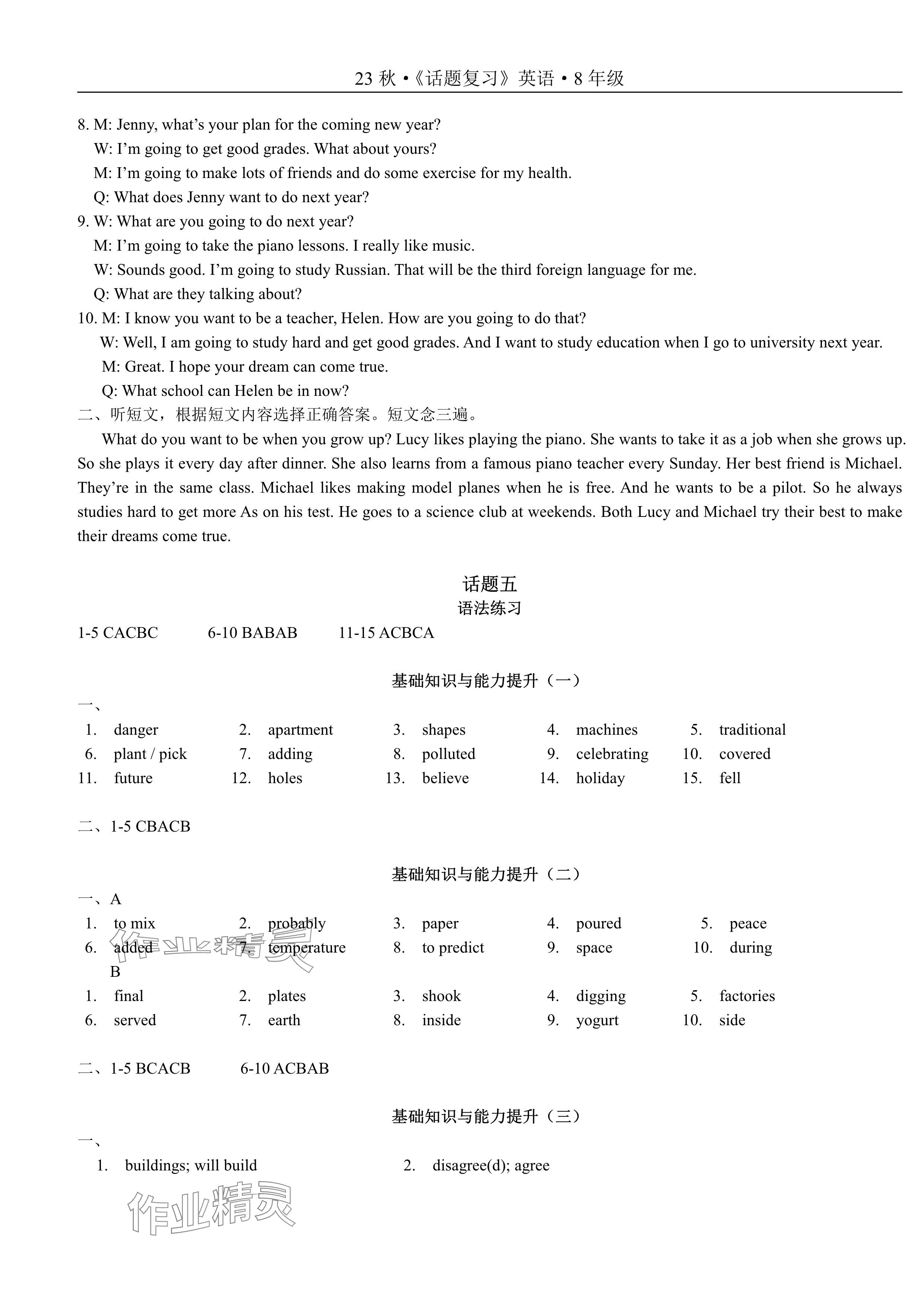 注:目前有些书本章节名称可能整理的还不是很完善,但都是按照顺序排列的,请同学们按照顺序仔细查找。练习册 2024年初中英语话题复习寒假作业八年级人教版 答案主要是用来给同学们做完题方便对答案用的,请勿直接抄袭。