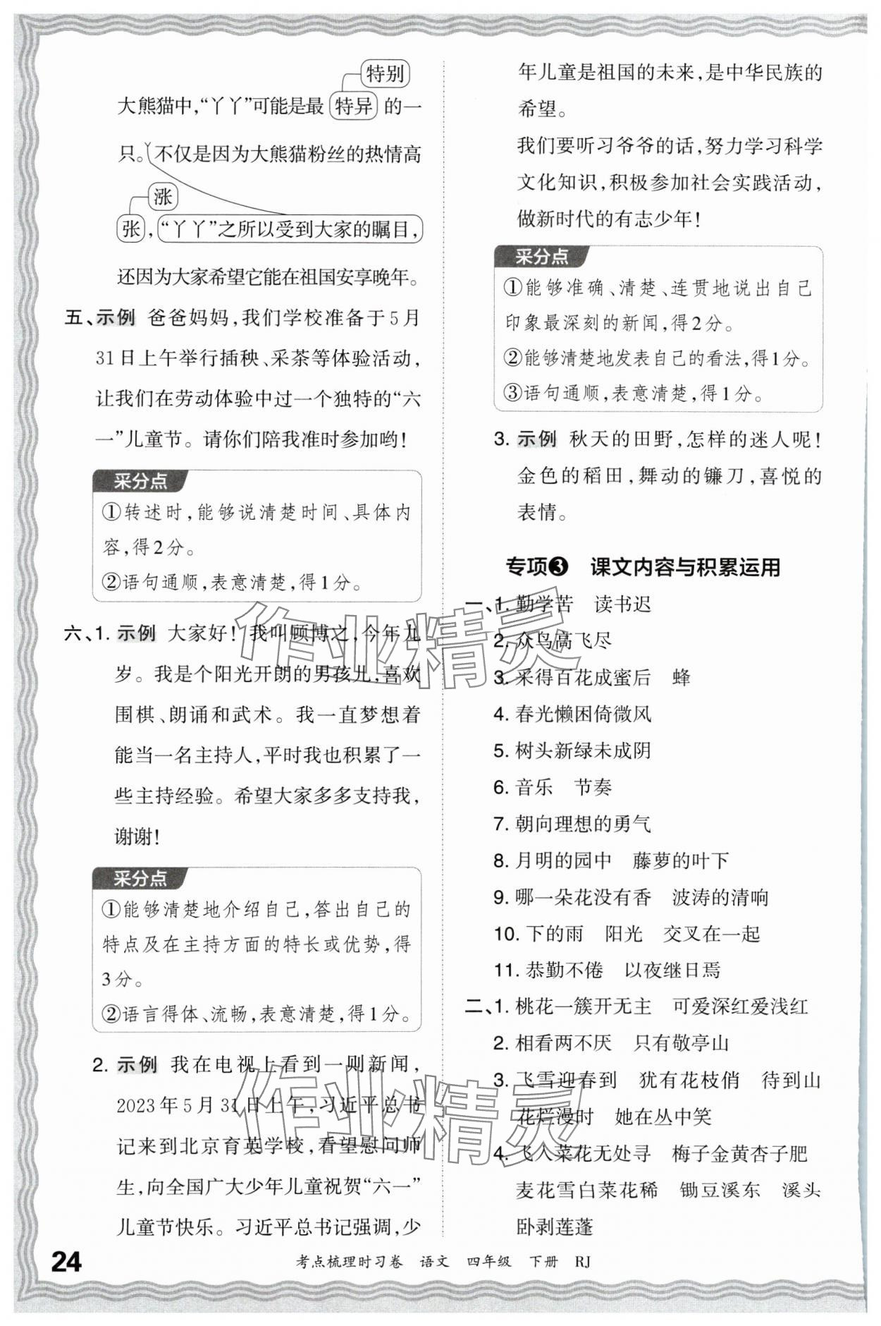 2024年王朝霞考点梳理时习卷四年级语文下册人教版