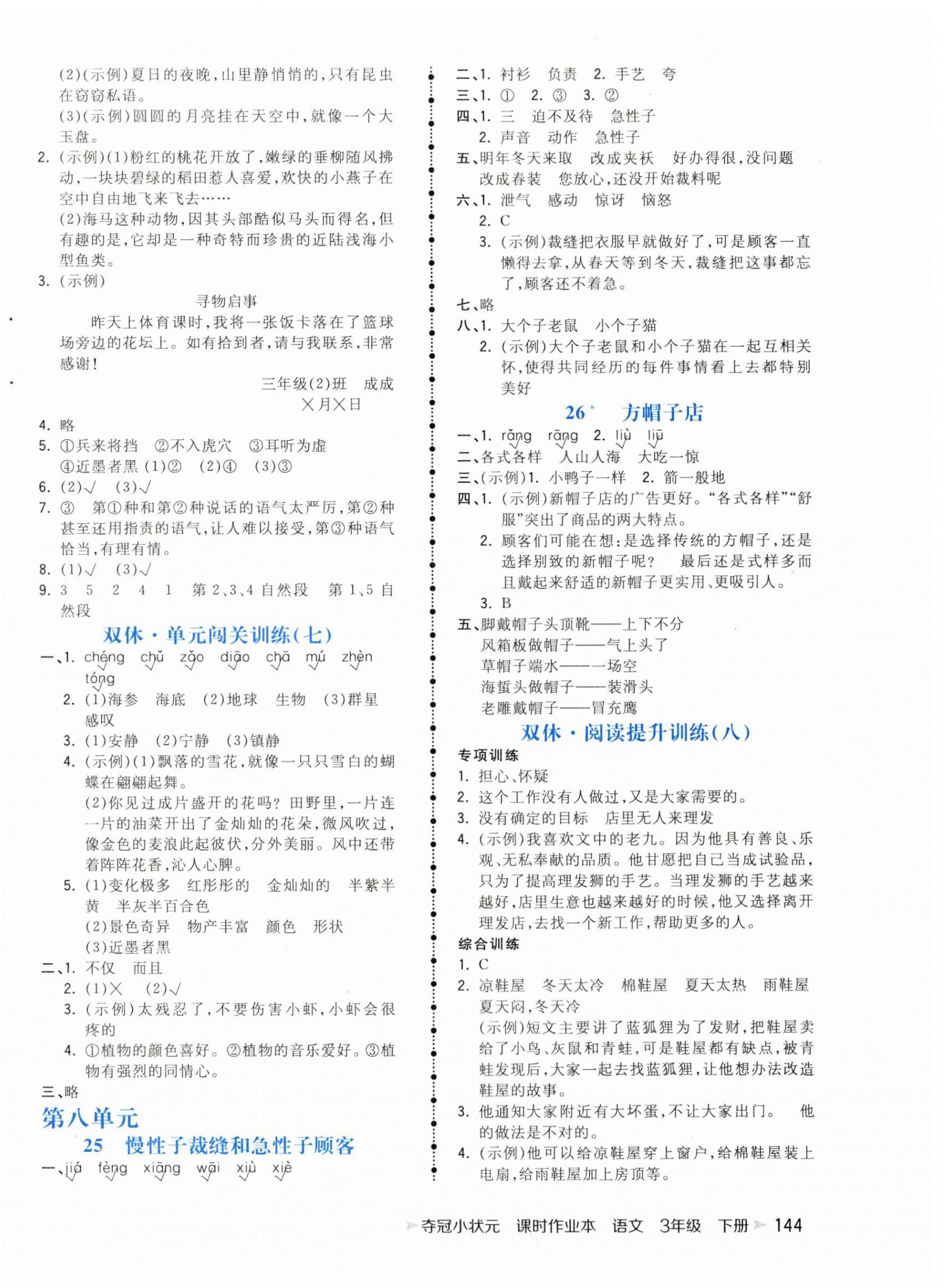 注:目前有些书本章节名称可能整理的还不是很完善,但都是按照顺序排列的,请同学们按照顺序仔细查找。练习册 2024年夺冠小状元课时作业本三年级语文下册人教版 答案主要是用来给同学们做完题方便对答案用的,请勿直接抄袭。