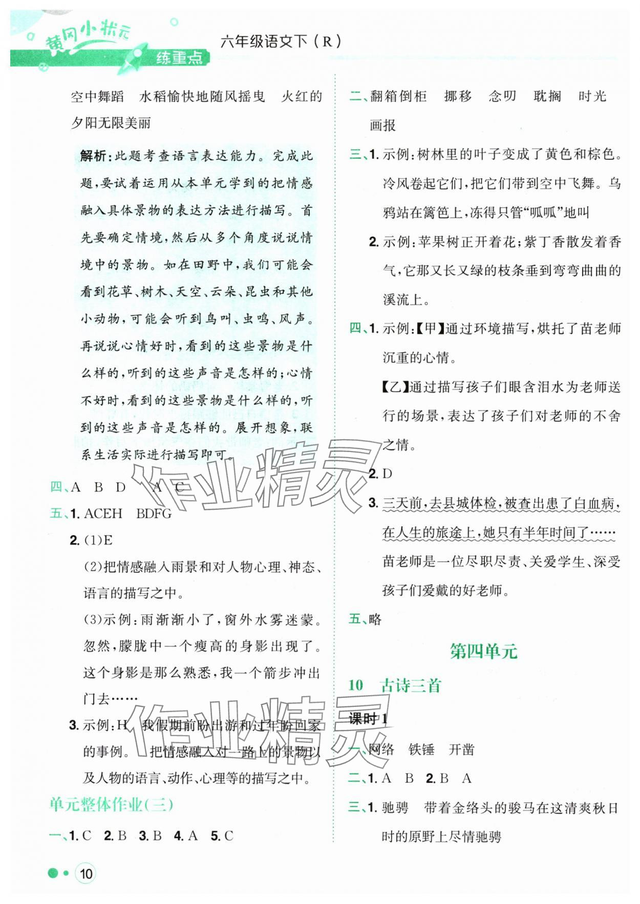 注:目前有些书本章节名称可能整理的还不是很完善,但都是按照顺序排列的,请同学们按照顺序仔细查找。练习册 2024年黄冈小状元练重点六年级语文下册人教版 答案主要是用来给同学们做完题方便对答案用的,请勿直接抄袭。