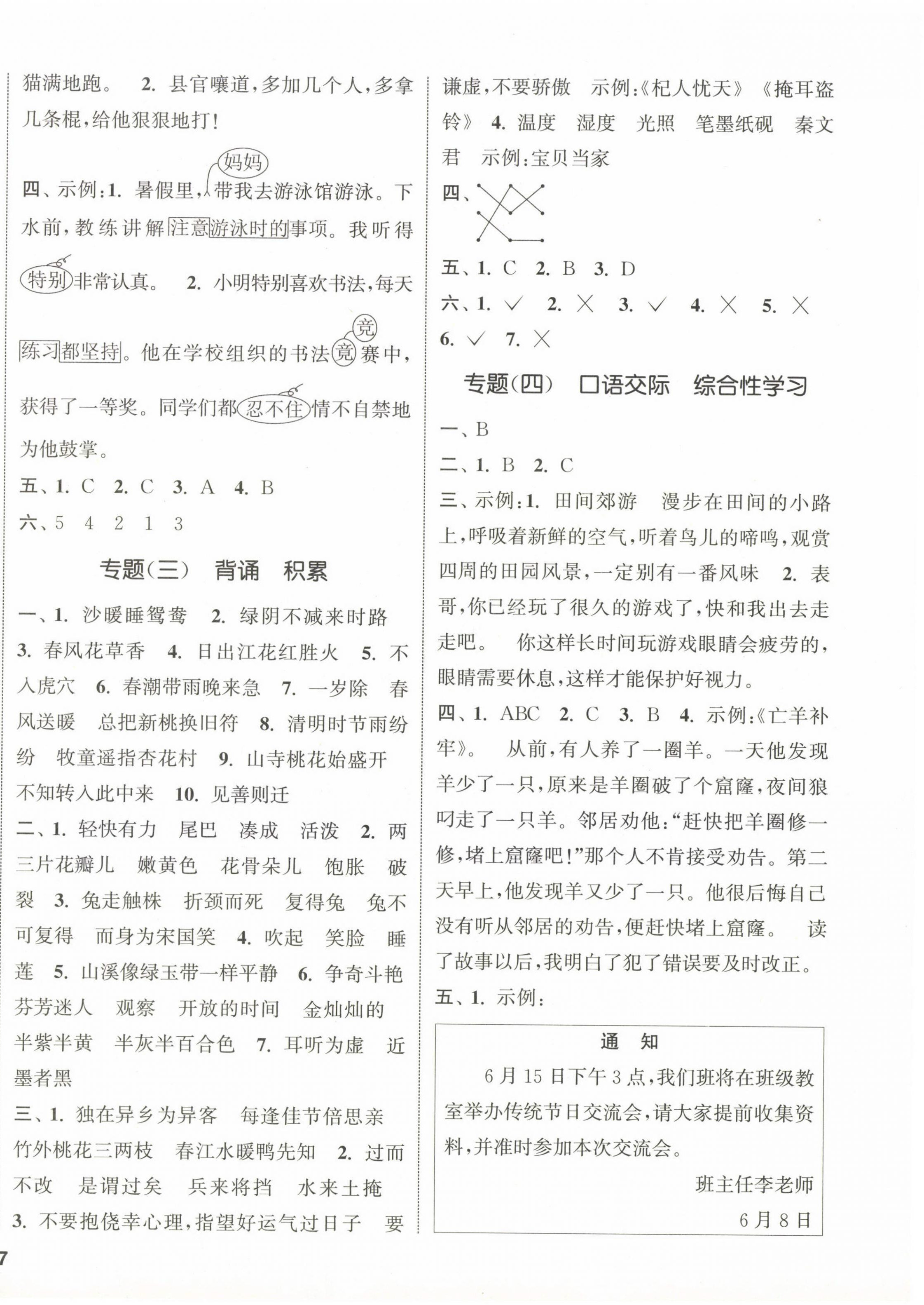 注:目前有些书本章节名称可能整理的还不是很完善,但都是按照顺序排列的,请同学们按照顺序仔细查找。练习册 2024年通城学典课时新体验三年级语文下册人教版 答案主要是用来给同学们做完题方便对答案用的,请勿直接抄袭。