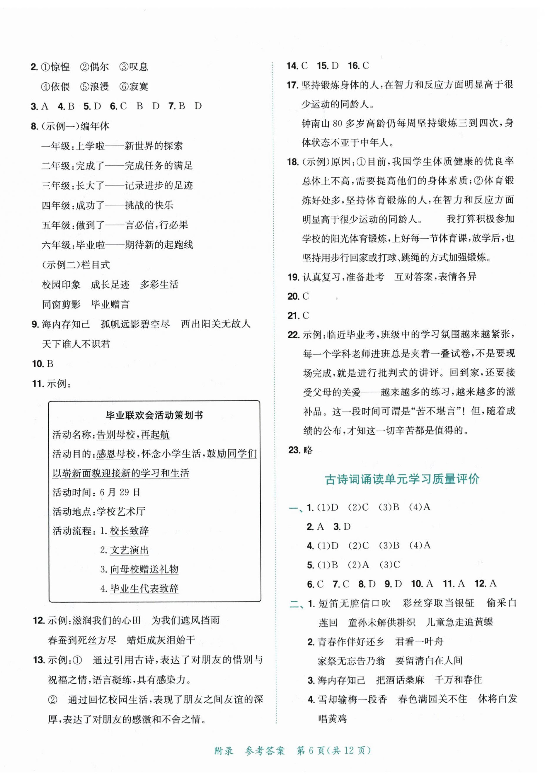 注:目前有些书本章节名称可能整理的还不是很完善,但都是按照顺序排列的,请同学们按照顺序仔细查找。练习册 2024年黄冈小状元达标卷六年级语文下册人教版 答案主要是用来给同学们做完题方便对答案用的,请勿直接抄袭。