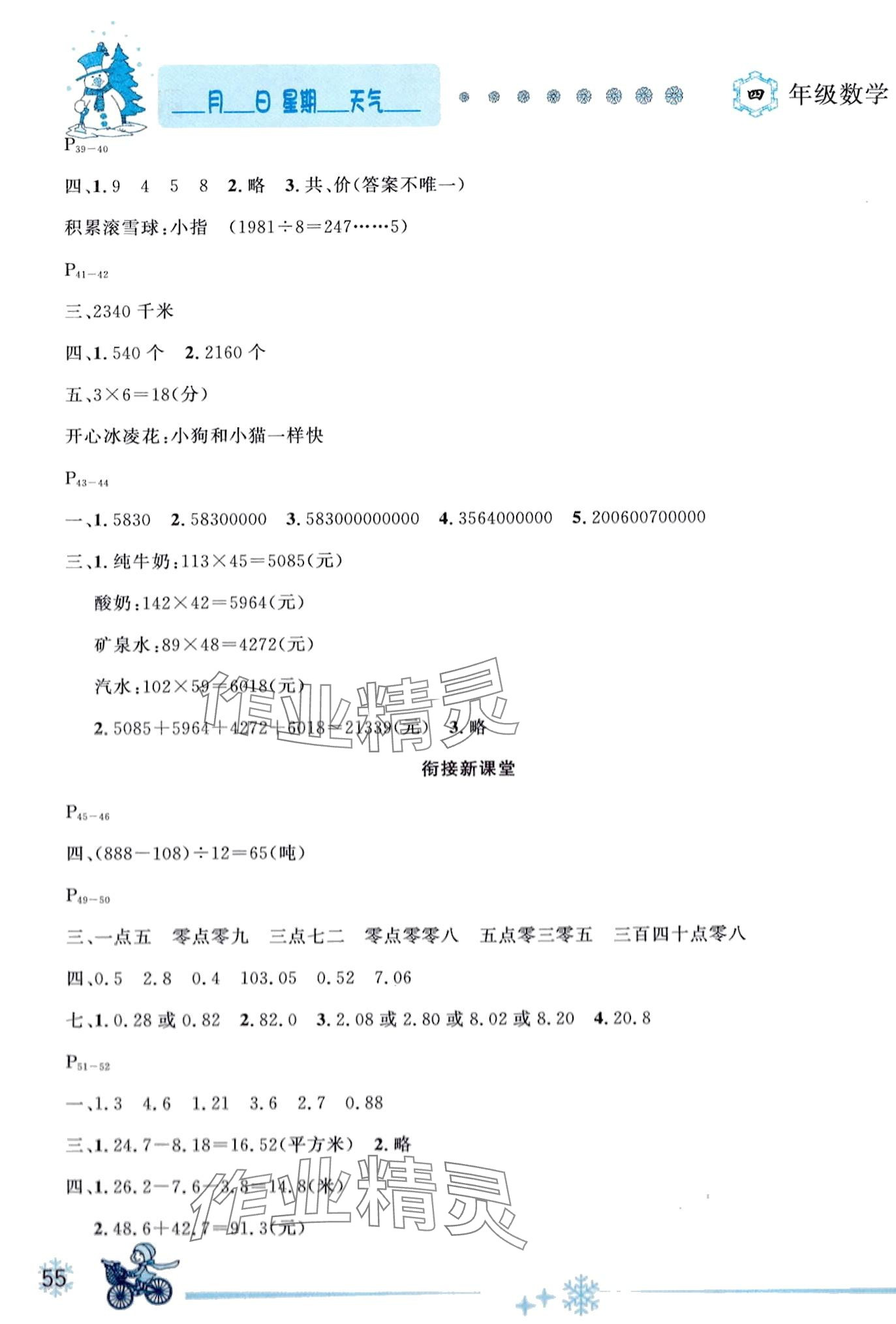 注:目前有些书本章节名称可能整理的还不是很完善,但都是按照顺序排列的,请同学们按照顺序仔细查找。练习册 2024年优秀生快乐假期每一天全新寒假作业本四年级数学人教版 答案主要是用来给同学们做完题方便对答案用的,请勿直接抄袭。