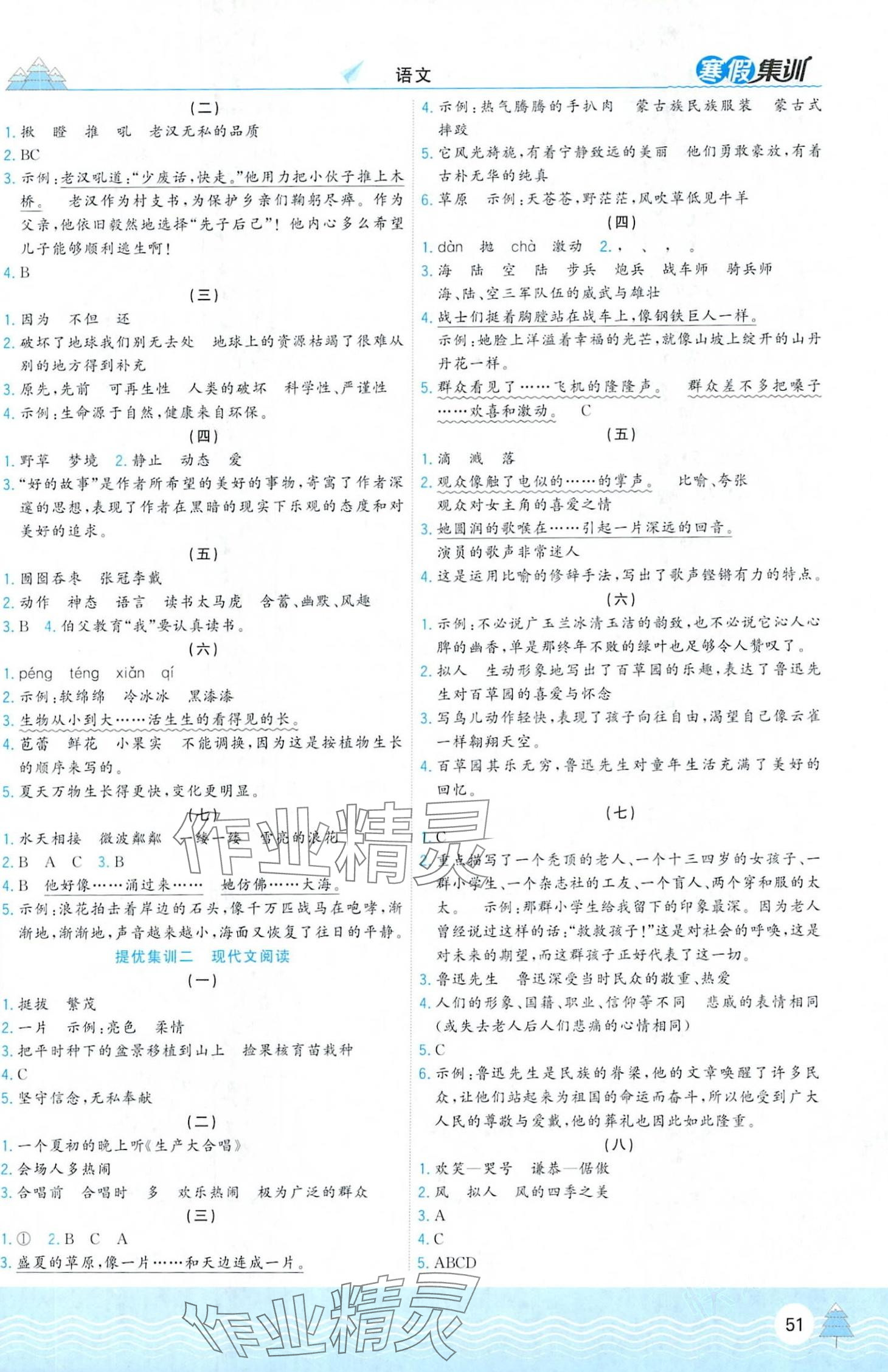 注:目前有些书本章节名称可能整理的还不是很完善,但都是按照顺序排列的,请同学们按照顺序仔细查找。练习册 2024年寒假集训合肥工业大学出版社六年级语文人教版 答案主要是用来给同学们做完题方便对答案用的,请勿直接抄袭。
