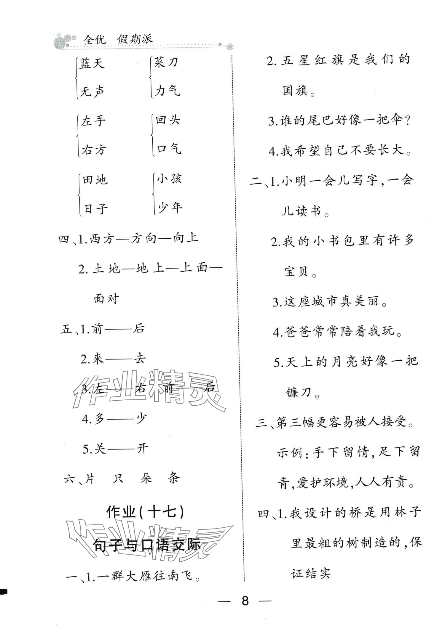 注:目前有些书本章节名称可能整理的还不是很完善,但都是按照顺序排列的,请同学们按照顺序仔细查找。练习册 2024年全优假期派一年级语文人教版 答案主要是用来给同学们做完题方便对答案用的,请勿直接抄袭。