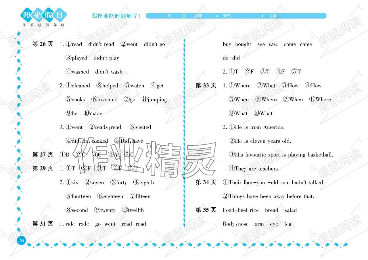 注:目前有些书本章节名称可能整理的还不是很完善,但都是按照顺序排列的,请同学们按照顺序仔细查找。练习册 2024年阳光假日寒假四年级英语外研版一起 答案主要是用来给同学们做完题方便对答案用的,请勿直接抄袭。