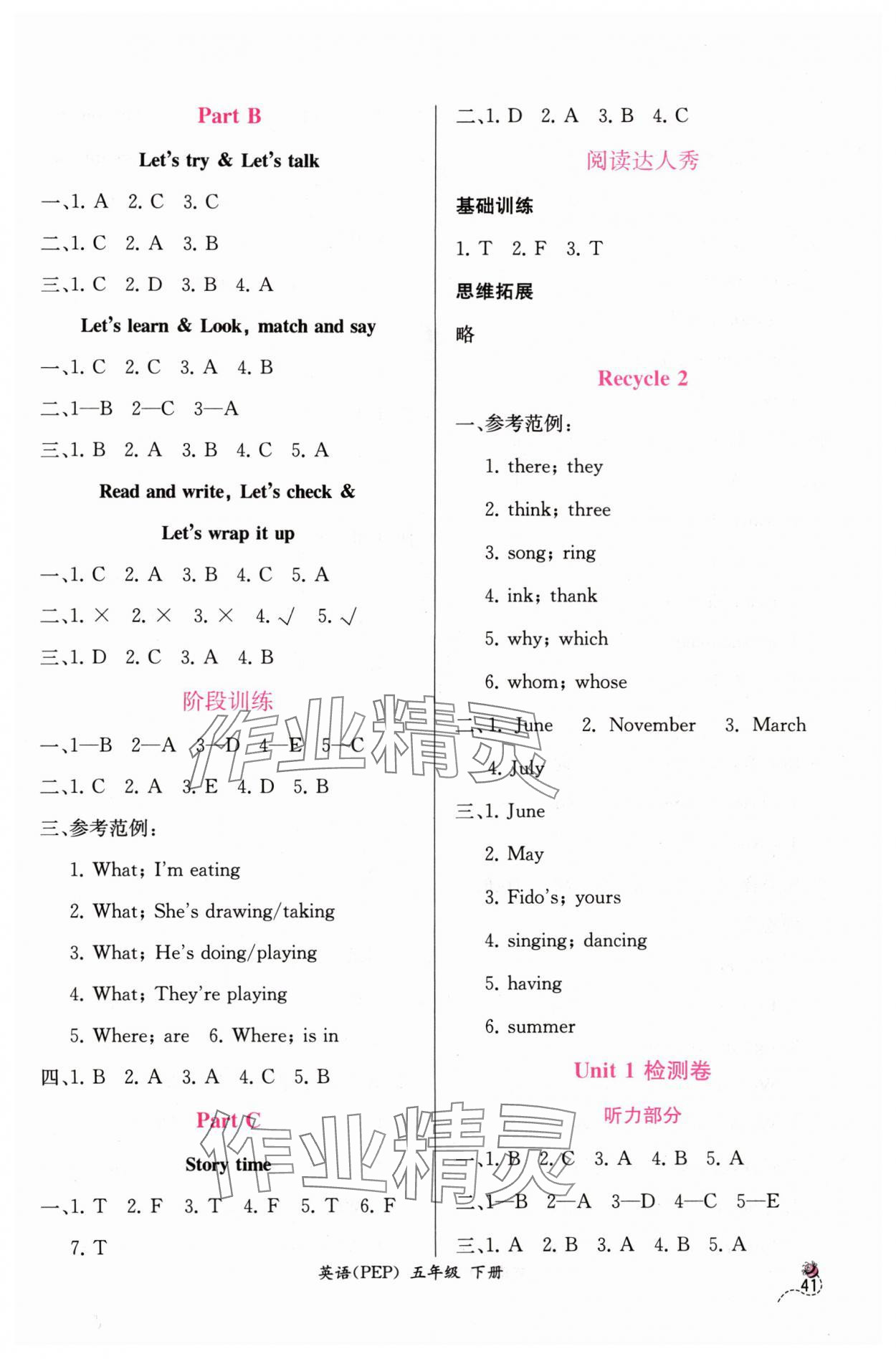 注:目前有些书本章节名称可能整理的还不是很完善,但都是按照顺序排列的,请同学们按照顺序仔细查找。练习册 2024年课时练人民教育出版社五年级英语下册人教版 答案主要是用来给同学们做完题方便对答案用的,请勿直接抄袭。