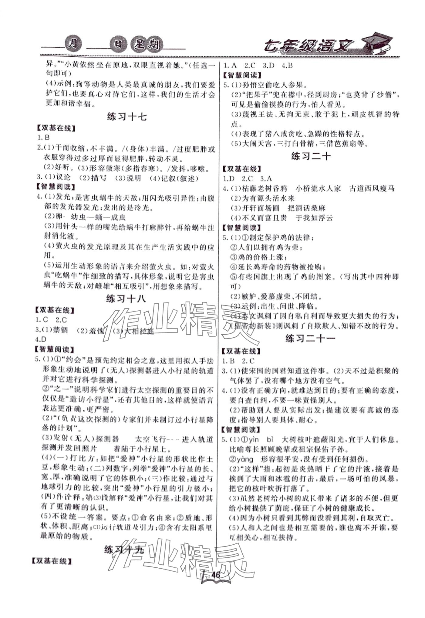 注:目前有些书本章节名称可能整理的还不是很完善,但都是按照顺序排列的,请同学们按照顺序仔细查找。练习册 2024年优等生寒假作业云南人民出版社七年级语文 答案主要是用来给同学们做完题方便对答案用的,请勿直接抄袭。