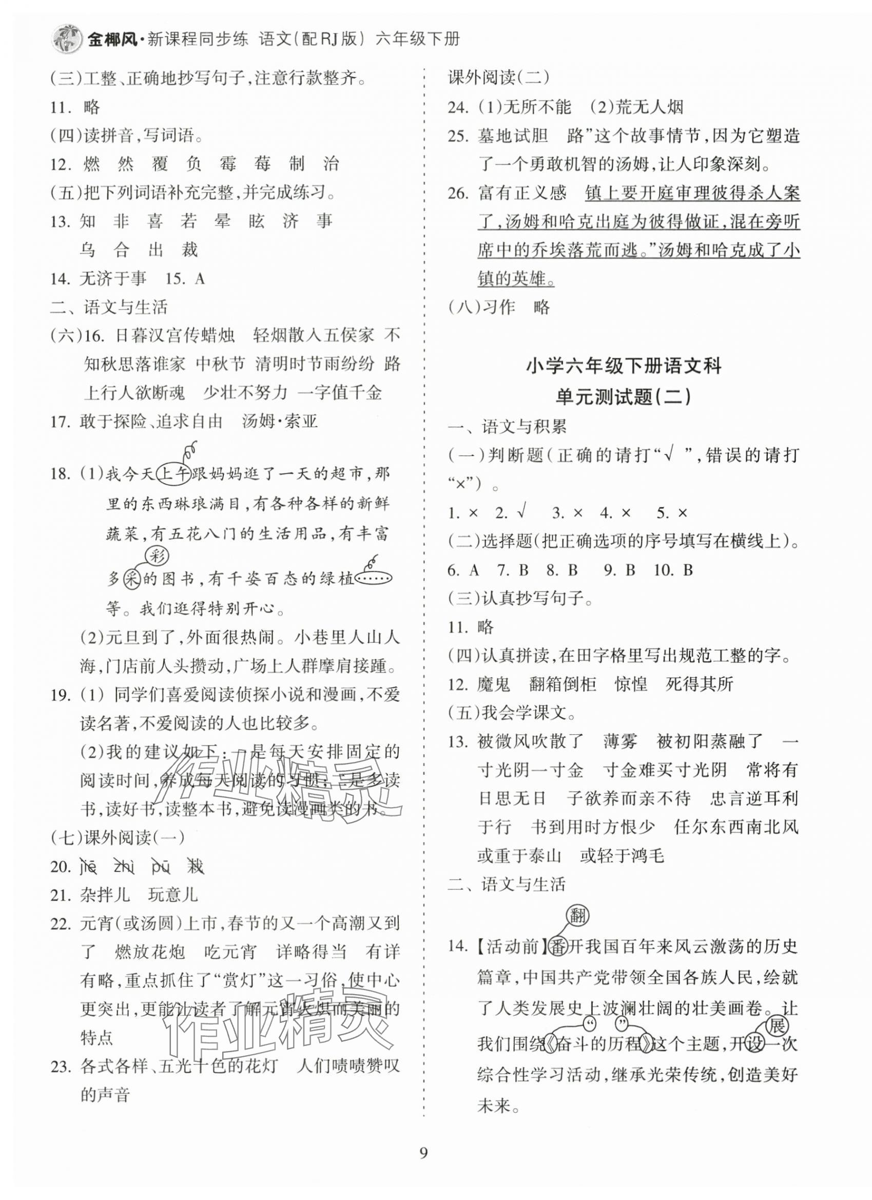 注:目前有些书本章节名称可能整理的还不是很完善,但都是按照顺序排列的,请同学们按照顺序仔细查找。练习册 2024年金椰风新课程同步练六年级语文下册人教版 答案主要是用来给同学们做完题方便对答案用的,请勿直接抄袭。