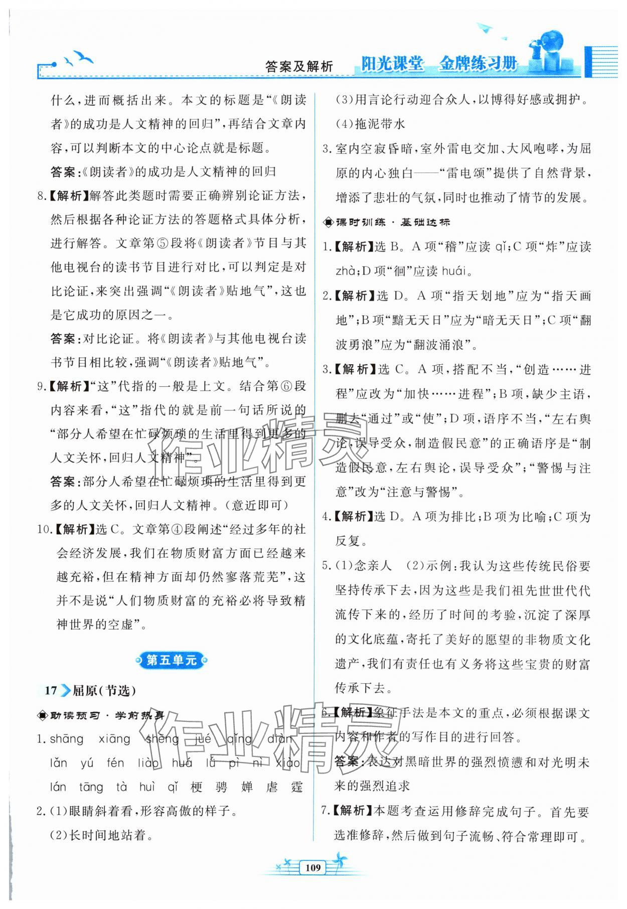注:目前有些书本章节名称可能整理的还不是很完善,但都是按照顺序排列的,请同学们按照顺序仔细查找。练习册 2024年阳光课堂金牌练习册九年级语文下册人教版福建专版 答案主要是用来给同学们做完题方便对答案用的,请勿直接抄袭。