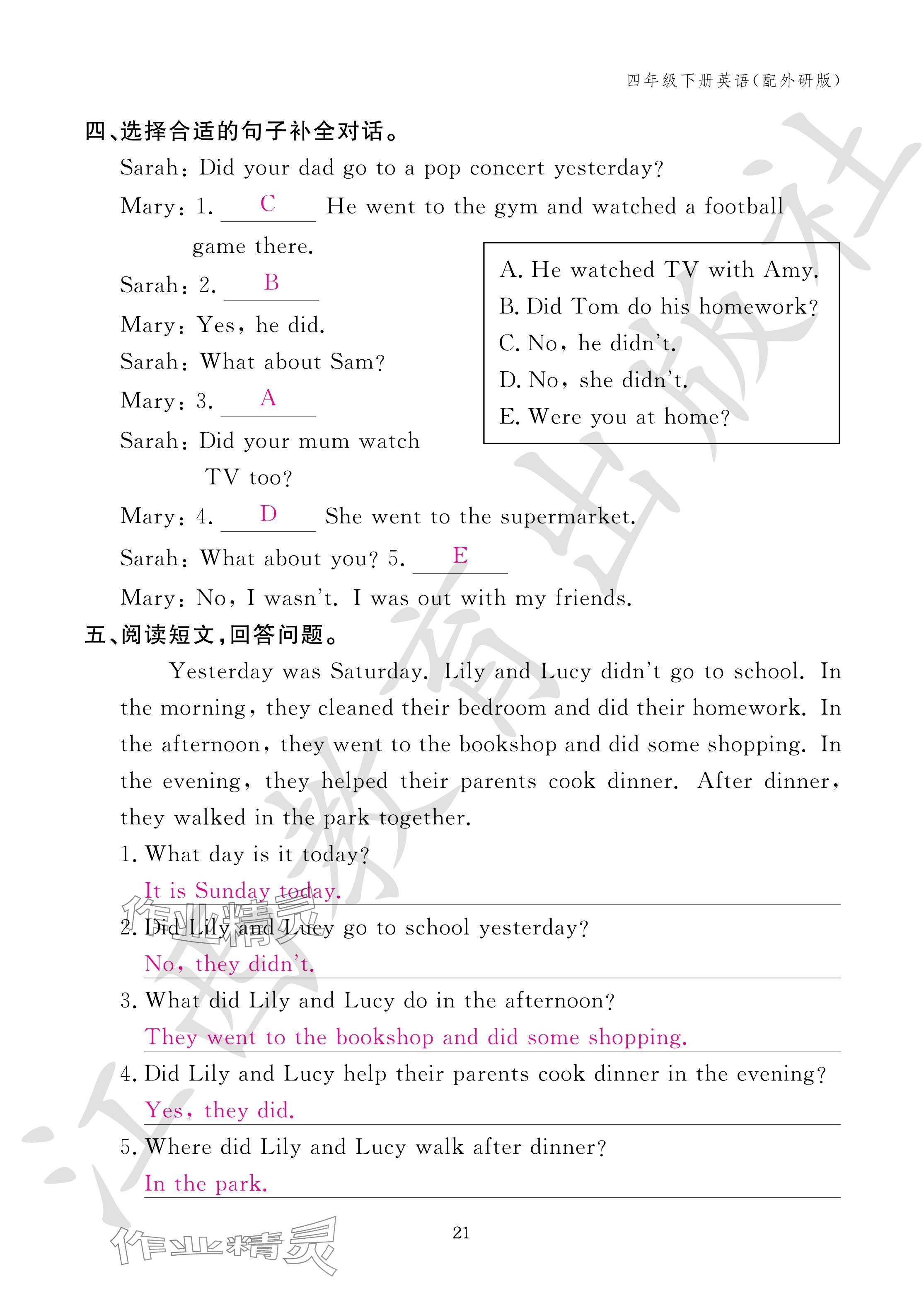 注:目前有些书本章节名称可能整理的还不是很完善,但都是按照顺序排列的,请同学们按照顺序仔细查找。练习册 2024年作业本江西教育出版社四年级英语下册外研版 答案主要是用来给同学们做完题方便对答案用的,请勿直接抄袭。