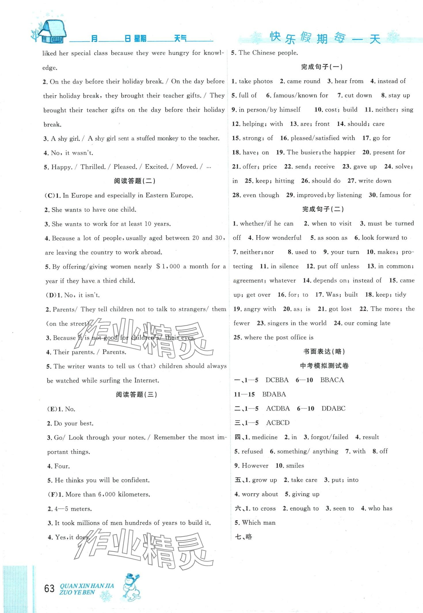 注:目前有些书本章节名称可能整理的还不是很完善,但都是按照顺序排列的,请同学们按照顺序仔细查找。练习册 2024年优秀生快乐假期每一天全新寒假作业本九年级英语人教版中考复习版 答案主要是用来给同学们做完题方便对答案用的,请勿直接抄袭。