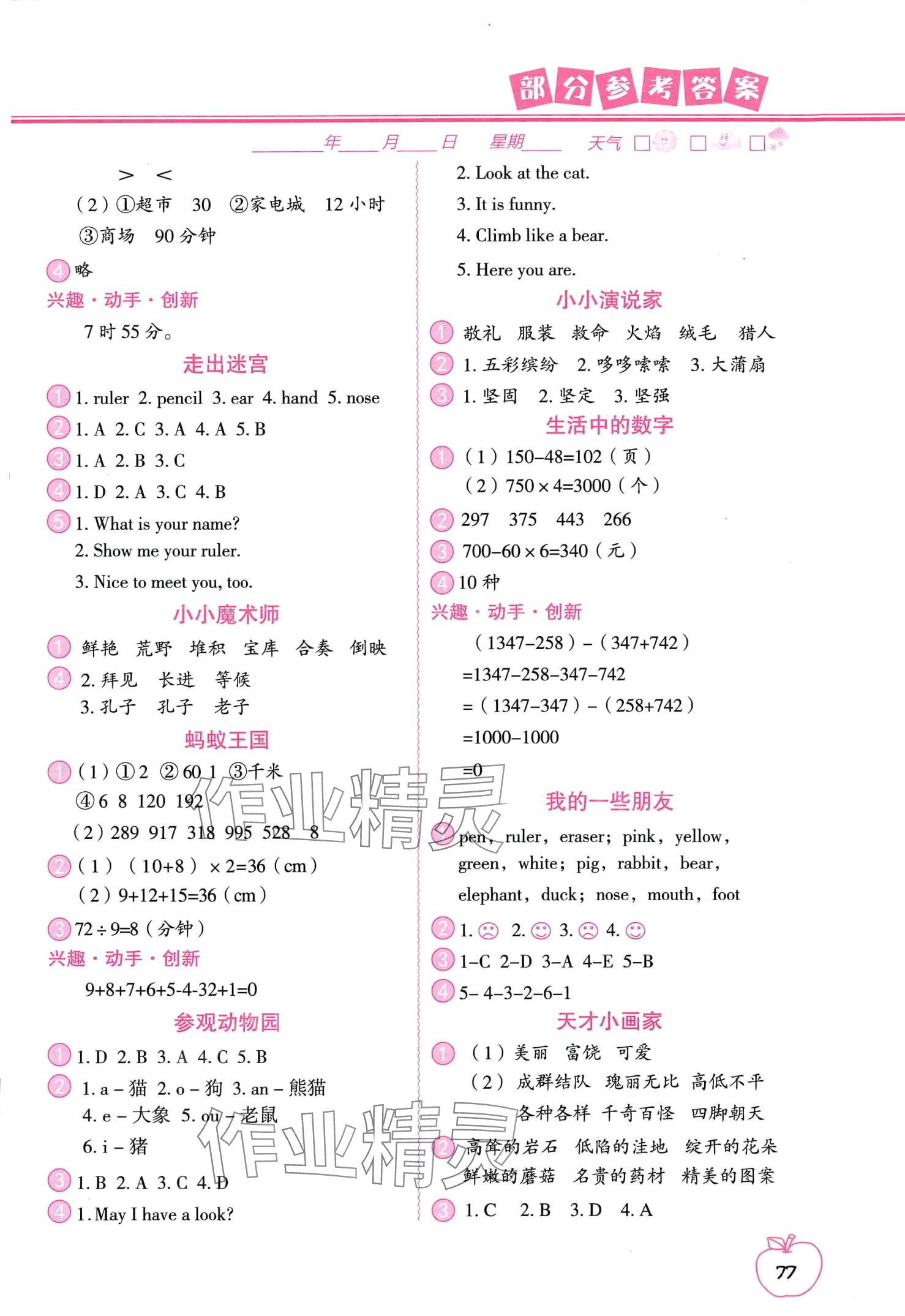 注:目前有些书本章节名称可能整理的还不是很完善,但都是按照顺序排列的,请同学们按照顺序仔细查找。练习册 2024年聪明屋寒暑假作业系列丛书寒假作业三年级综合 答案主要是用来给同学们做完题方便对答案用的,请勿直接抄袭。