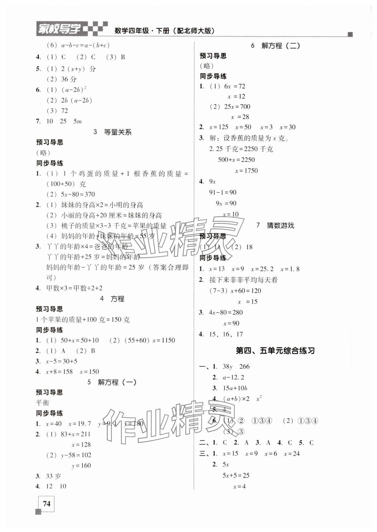 2024年家校导学小学课时南粤练案四年级数学下册北师大版