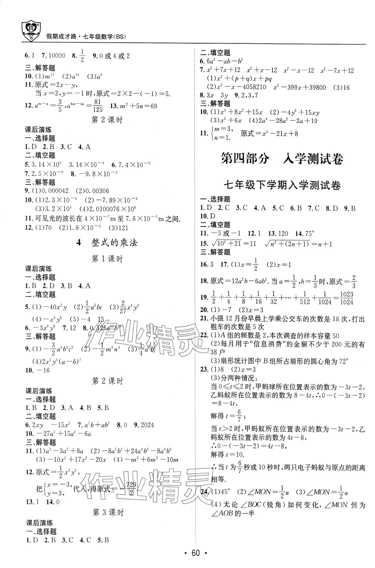 注:目前有些书本章节名称可能整理的还不是很完善,但都是按照顺序排列的,请同学们按照顺序仔细查找。练习册 2024年假期成才路七年级数学北师大版 答案主要是用来给同学们做完题方便对答案用的,请勿直接抄袭。
