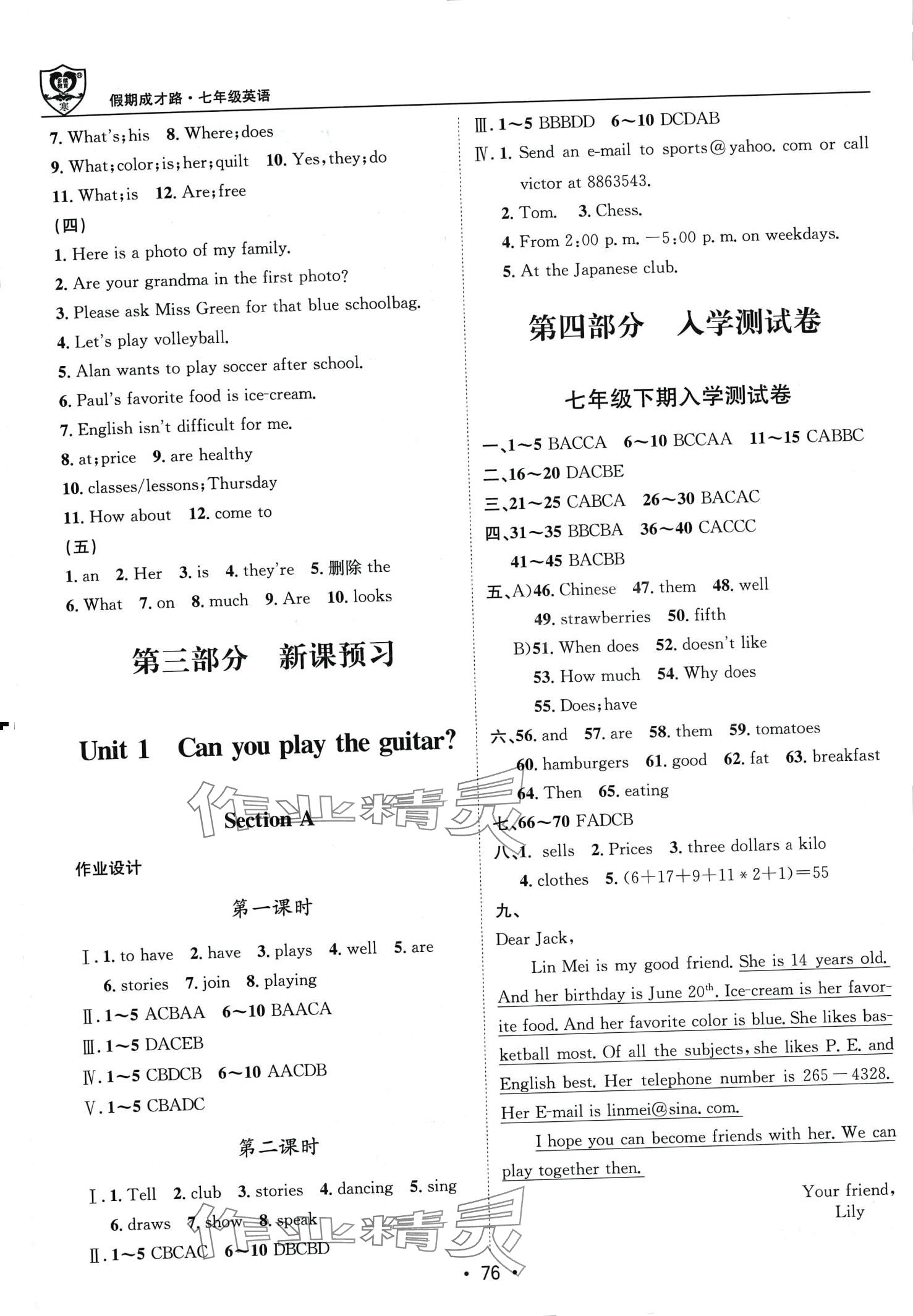 注:目前有些书本章节名称可能整理的还不是很完善,但都是按照顺序排列的,请同学们按照顺序仔细查找。练习册 2024年假期成才路七年级英语人教版 答案主要是用来给同学们做完题方便对答案用的,请勿直接抄袭。