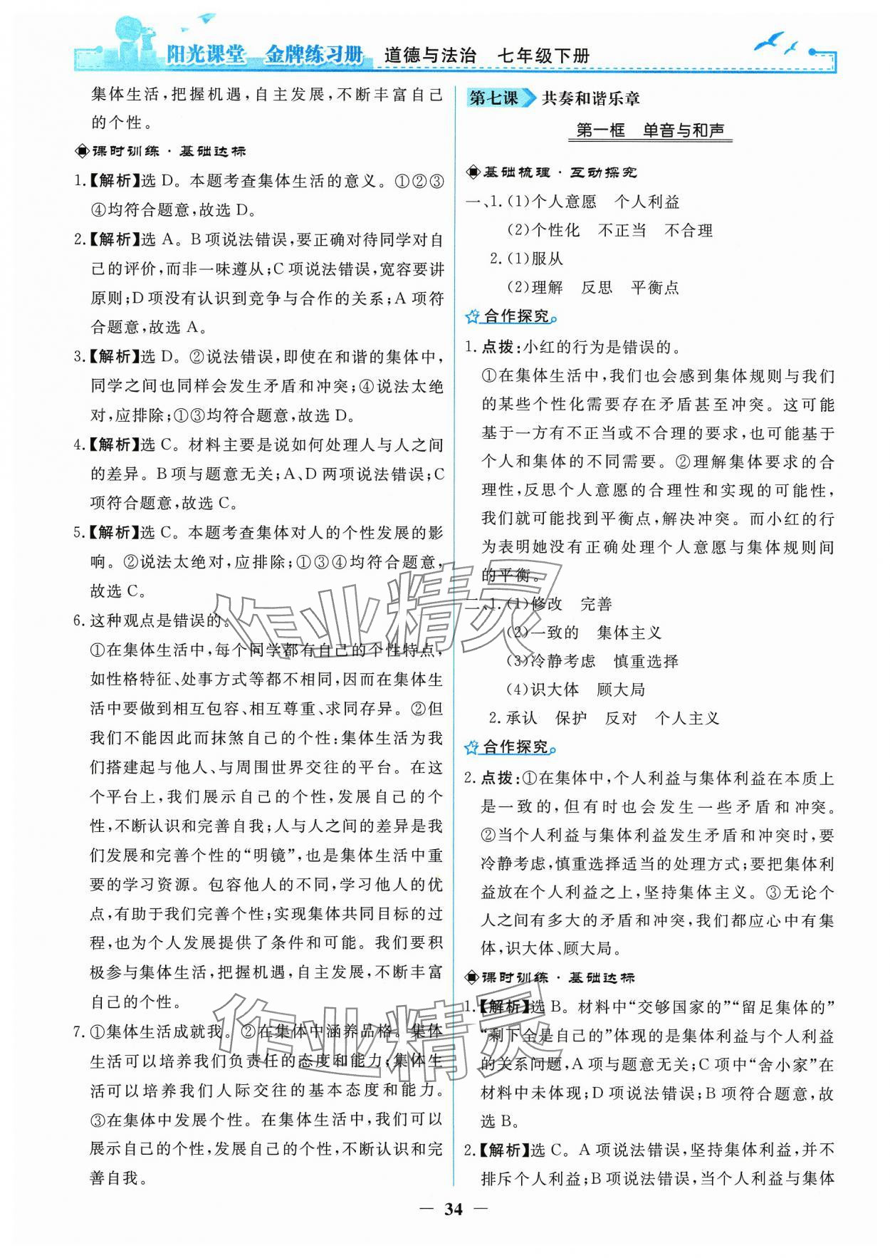 2024年阳光课堂金牌练习册七年级道德与法治下册人教版