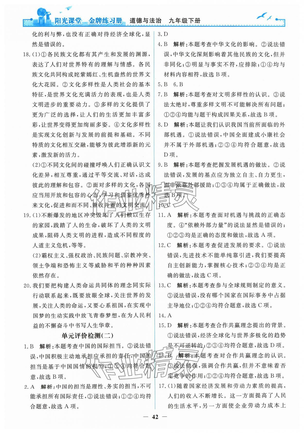 2024年阳光课堂金牌练习册九年级道德与法治下册人教版