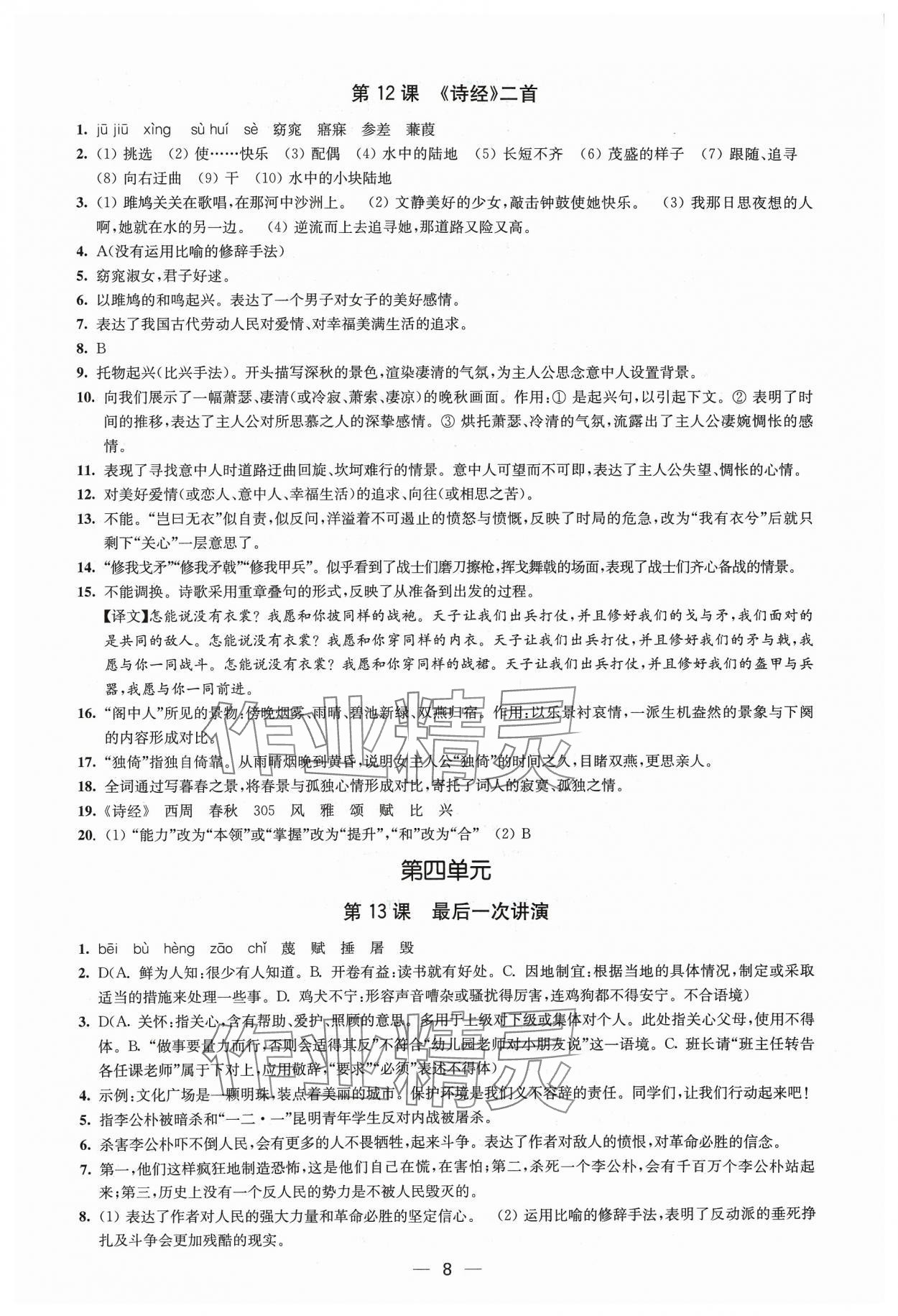 注:目前有些书本章节名称可能整理的还不是很完善,但都是按照顺序排列的,请同学们按照顺序仔细查找。练习册 2024年创新课时作业八年级语文下册人教版 答案主要是用来给同学们做完题方便对答案用的,请勿直接抄袭。