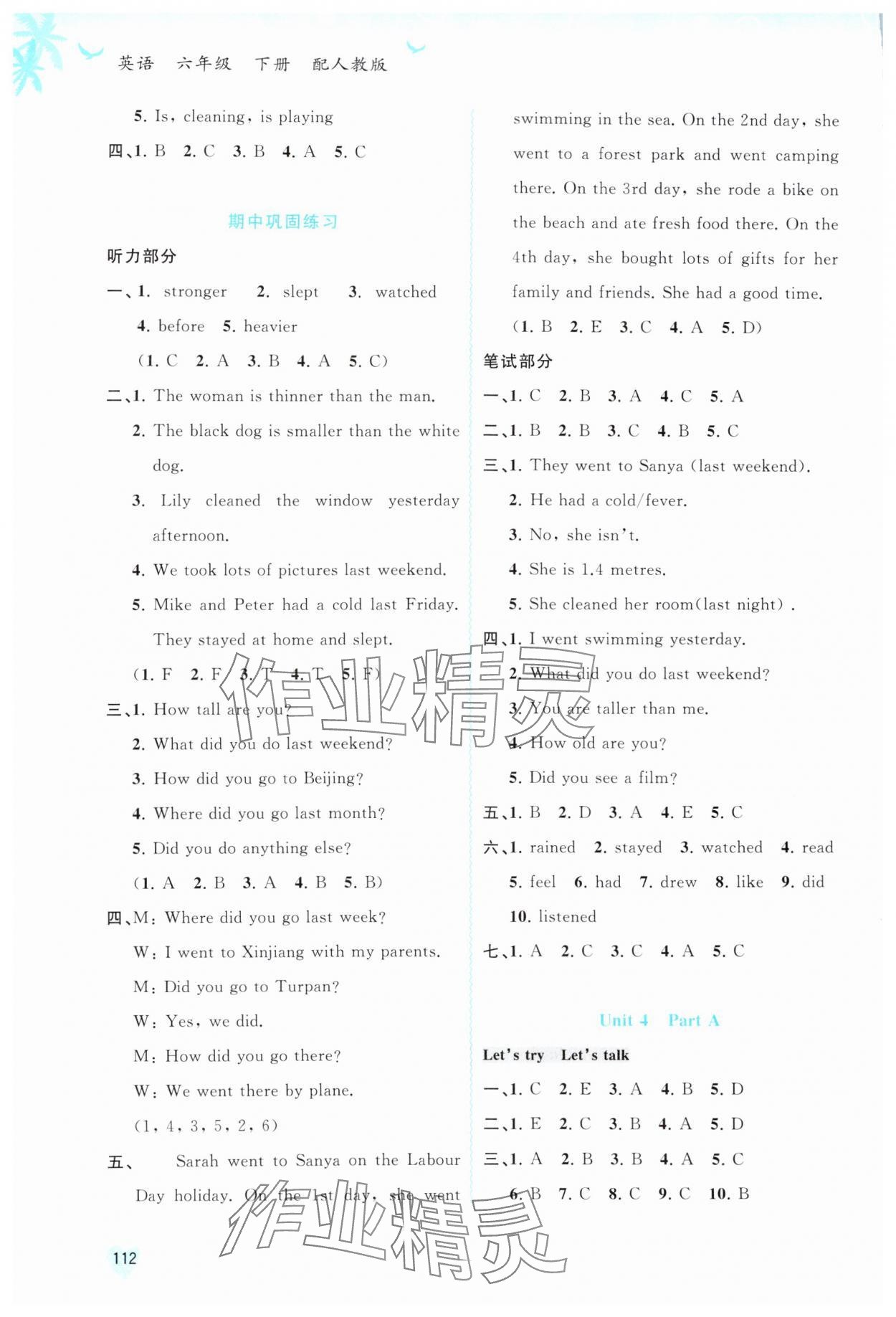 注:目前有些书本章节名称可能整理的还不是很完善,但都是按照顺序排列的,请同学们按照顺序仔细查找。练习册 2024年新课程学习与测评同步学习六年级英语下册人教版 答案主要是用来给同学们做完题方便对答案用的,请勿直接抄袭。