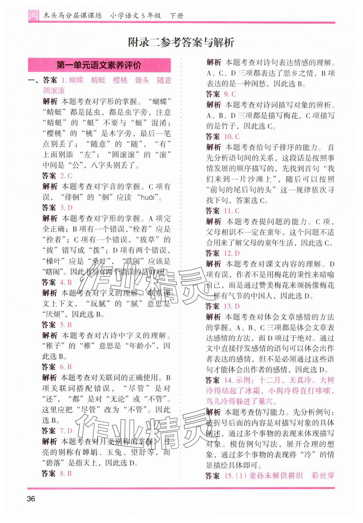 注:目前有些书本章节名称可能整理的还不是很完善,但都是按照顺序排列的,请同学们按照顺序仔细查找。练习册 2024年木头马分层课课练五年级语文下册人教版福建专版 答案主要是用来给同学们做完题方便对答案用的,请勿直接抄袭。