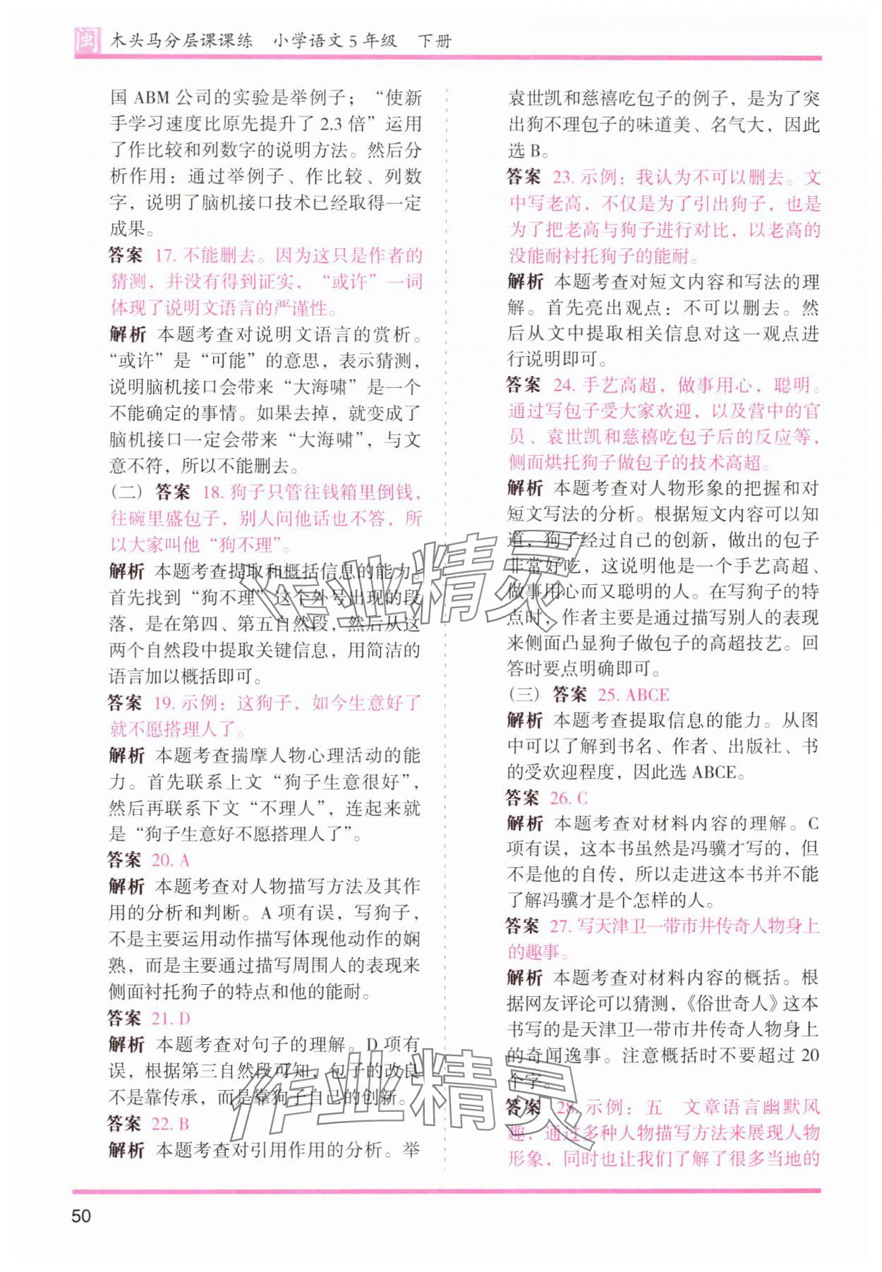 注:目前有些书本章节名称可能整理的还不是很完善,但都是按照顺序排列的,请同学们按照顺序仔细查找。练习册 2024年木头马分层课课练五年级语文下册人教版福建专版 答案主要是用来给同学们做完题方便对答案用的,请勿直接抄袭。