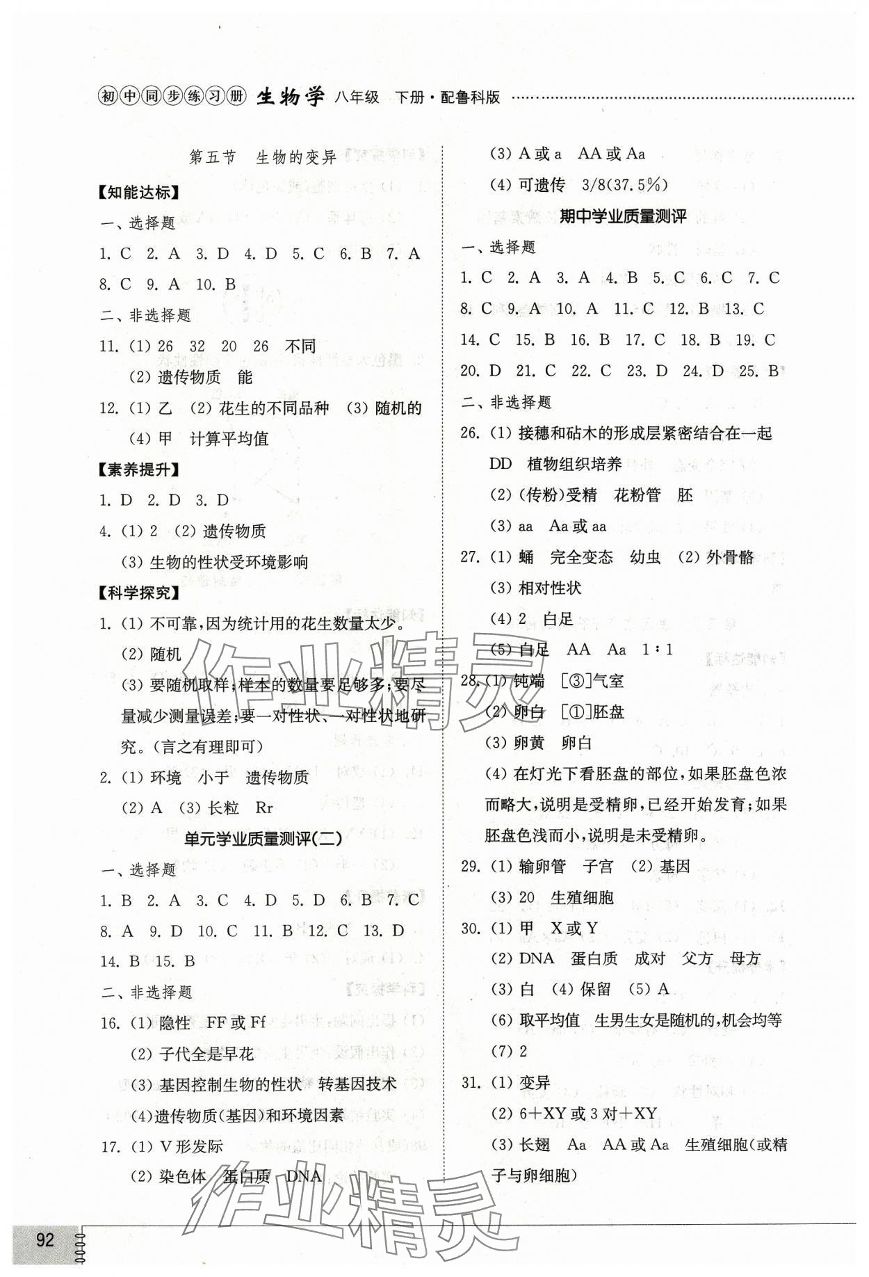 注:目前有些书本章节名称可能整理的还不是很完善,但都是按照顺序排列的,请同学们按照顺序仔细查找。练习册 2024年初中同步练习册八年级生物学下册鲁科版54制山东教育出版社 答案主要是用来给同学们做完题方便对答案用的,请勿直接抄袭。