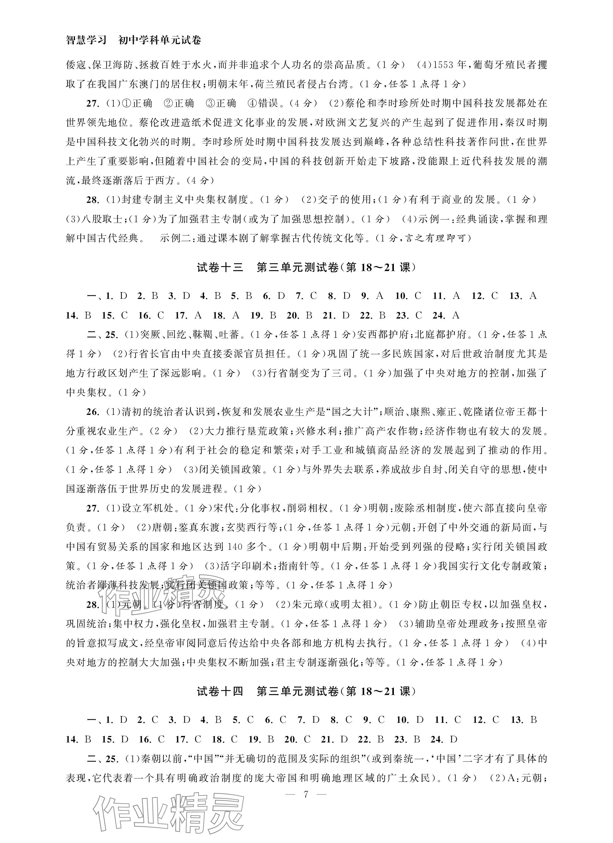 《2024年智慧学习初中学科单元试卷七年级历史下册人教版》